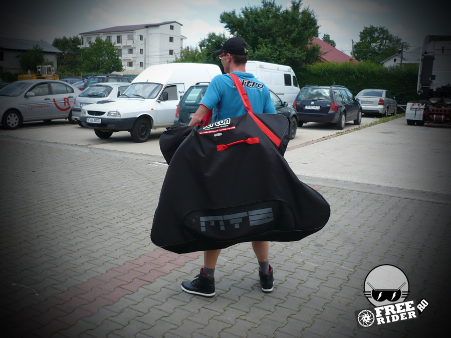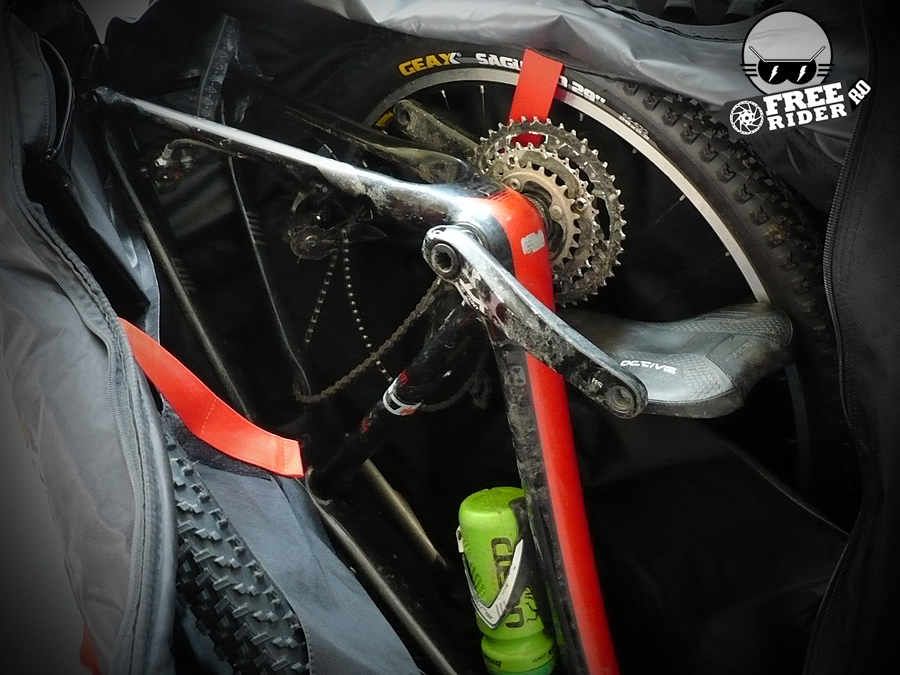 Mai departe, am fost incantat sa descopar ca nu mai aveam nevoie de nici o alta geanta pentru echipament si hainele “civile”, toate acestea avand loc berechet in geanta. Pentru ca am fost avertizat de cat de brutal sunt tratate bagajele in aeroporturi, m-am folosit de haine pentru a le plasa strategic in jurul partilor sensibile ale bicicletei, shiftere, manete de frana, etc. Mai ai la dispozitie si un buzunaras interior in care am ales sa imi pun diverse maruntisiri, tinand cont ca geanta se poate deschide foarte usor cu un fermoar dublu. Mai ramanea doar sa ajung la aeroport.
