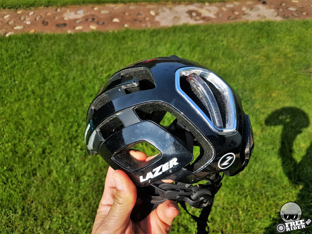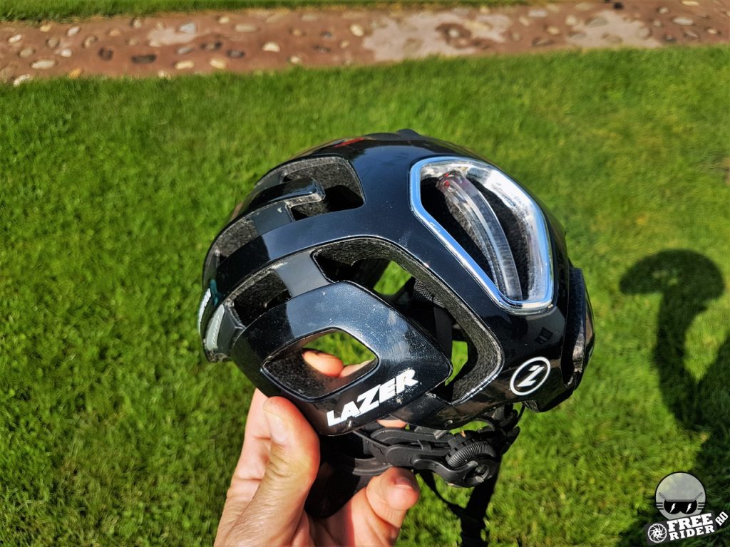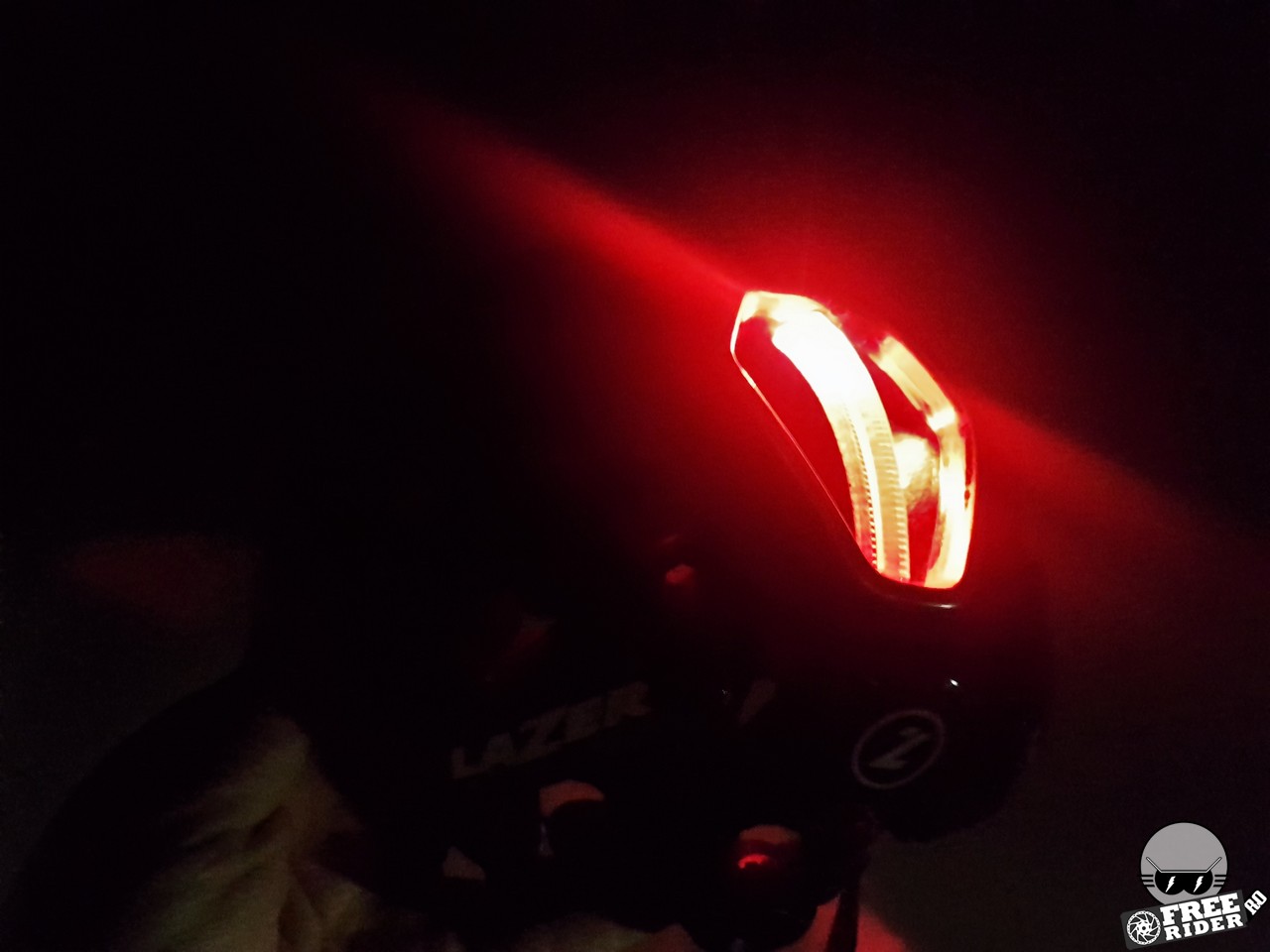Al doilea sistem interesant este lumina integrată în spate, care nu e doar un mic led cum se găsește la alte modele ci e sub forma unei bare led ce ocupă o porțiune de câțiva cm în zona cefei. Sistemul e amplasat în interior, are acumulator intern și se încarcă prin microUSB după ce este demontat, apoi se montează la loc. Nu e un proces laborior, însă pornirea necesită apăsarea unui buton care e cam greu accesibil cu mânuși. Sistemul nu are o intensitate foarte mare pentru a nu deranja ceilalți cicliști din pluton și are două moduri de funcționare, continuu și intermitent. Mi se pare foarte util pe traseele montane unde există multe treceri prin tunel și unde de obicei nu ne obosim să ducem cu noi un set de lumini pe bicicletă.