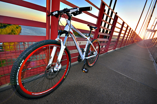 Bicicleta sa, un KTM Ultra Sport 2010, a fost surprinsă pe unul dintre cele mai mari poduri suspendate din Europa, podul Aquitaine, cu o lungime de 1.8 km.