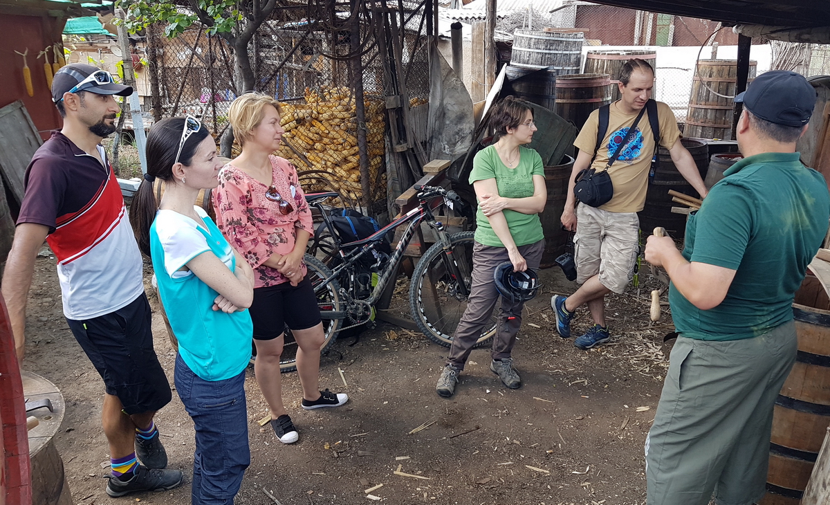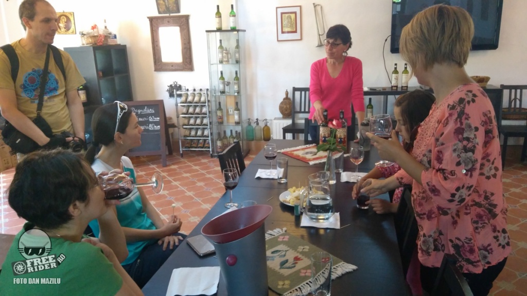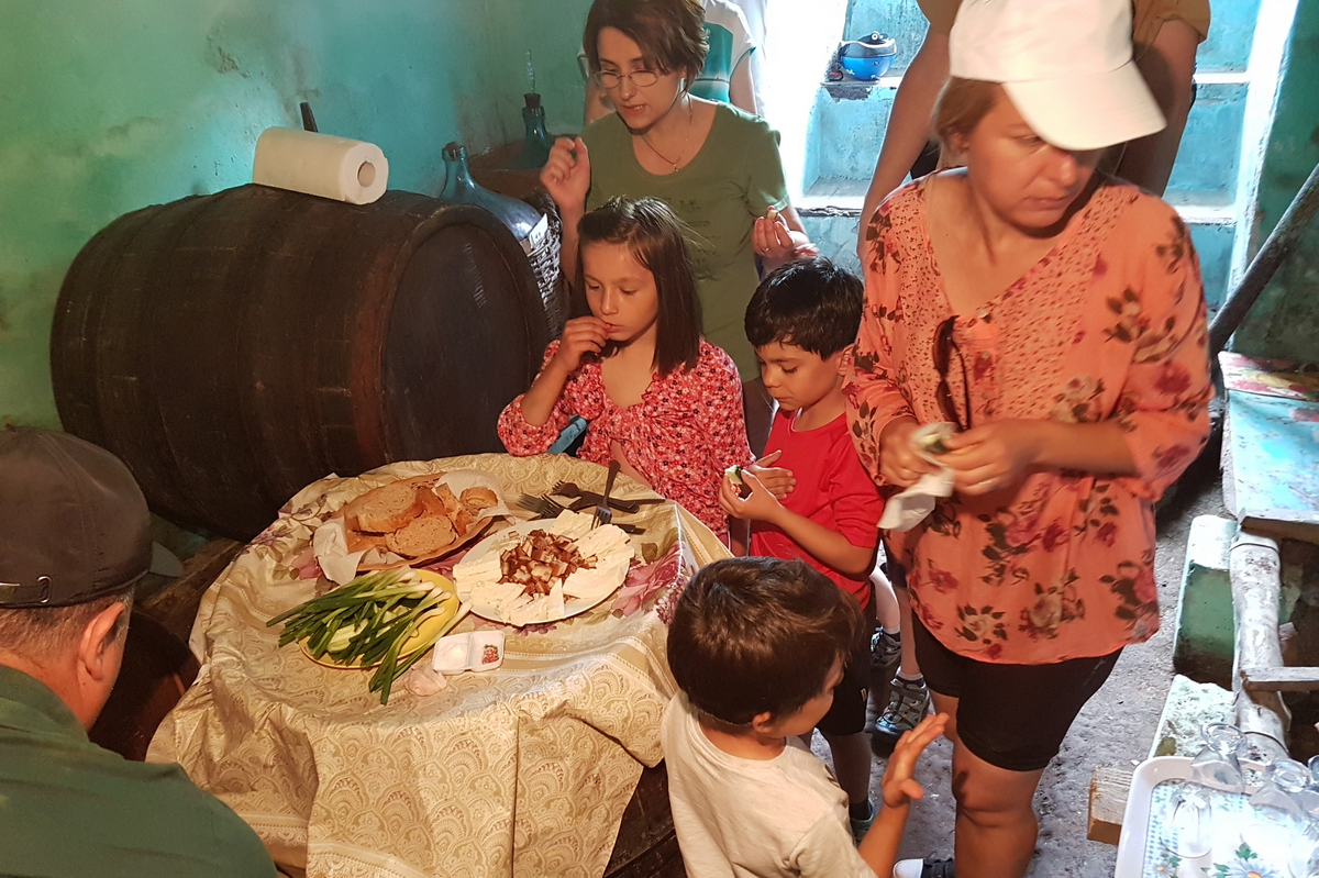 Popasul de la Adrian a fost cum nu se poate mai potrivit. Pe lângă poveștile despre butoaie și pe lângă faptul că cei mici s-au putut juca în curte cu diferitele instrumente tradiționale, meșterul din Ceptura ne-a pregătit și o masă cu slănină, brânză și ceapă, totul servit pe butoi în crama proprie, acompaniată de vinul propriu, un vin de masă, nepretențios, dar extrem de bun și gustos.