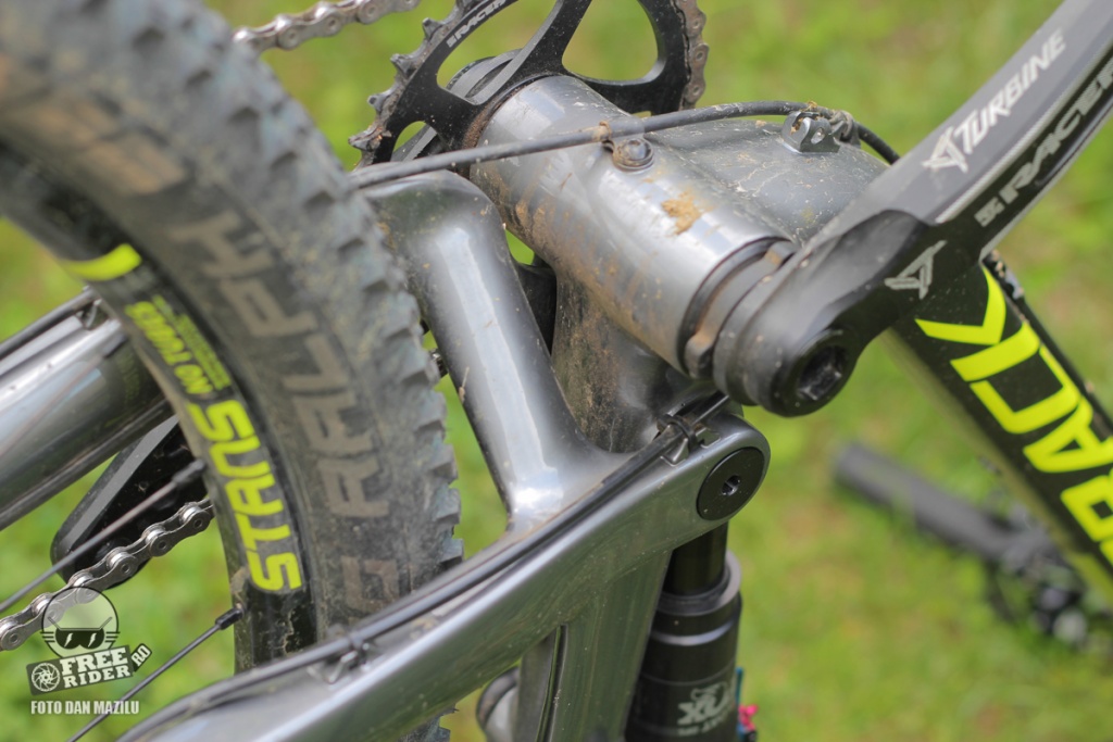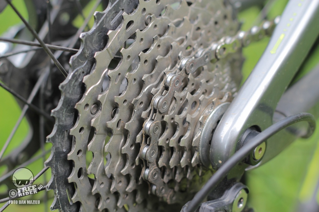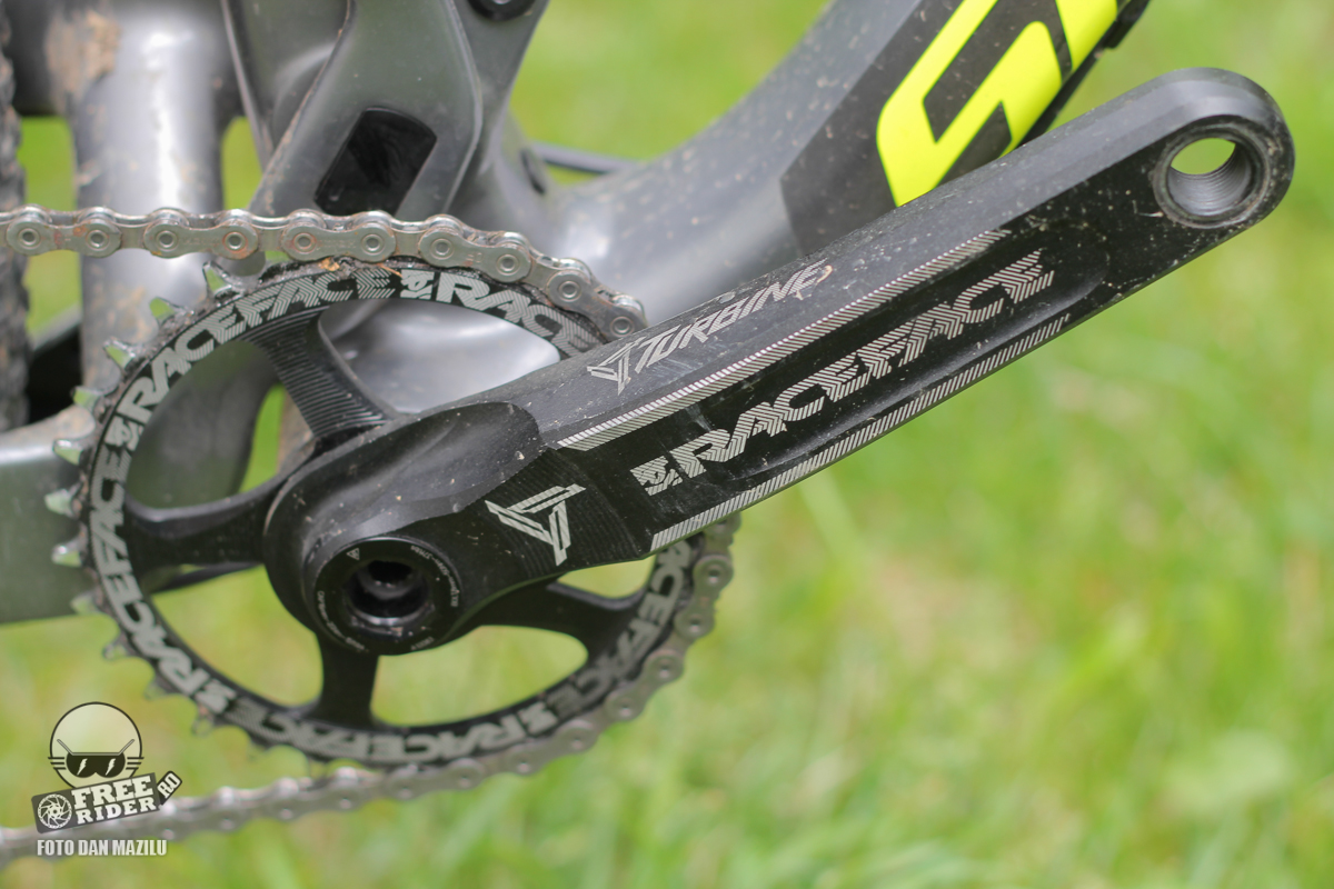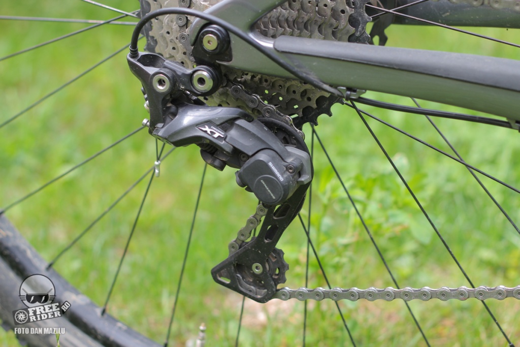 Apoi transmisia de tip 1x cu Shimano XT pe spate și pinioane XT pentru 11 viteze 11-42T. Foaia este de la RaceFace modelul Turbine cu 32T.