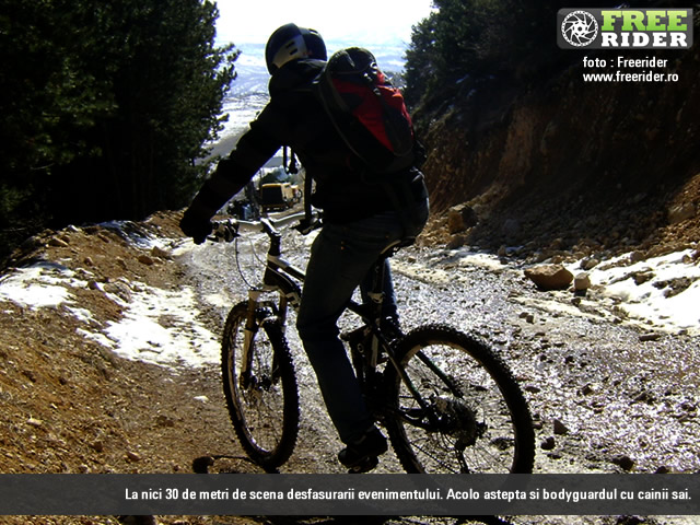 Dar dacă bunul simț îi lipsea cu desăvârșire, acesta compensa din plin cu un alt simț. Simțul răspunderii. După o coborâre lungă, plăcută, plină de extaz și de adrenalină (pe scurt, genială) cu bicicletele, ajung în locul care mi-a întărit ideea de „în România, așteaptă-te oricând la orice!”. În coborârea fulminantă pe care o savuram aproape cu bale la gură, mă văd nevoit să opresc brusc pentru că în cale mi se arată bodyguardul de munte însoțit de o șleahtă de patrupede, pe care probabil datorită sperieturii am perceput-o ca fiind de dimensiuni cosmice. Cu toate acestea se vedea clar că bodyguardul îi răsfăța cu mâncăruri din cele mai alese, deoarece dimensiunile lor erau chiar impresionante.