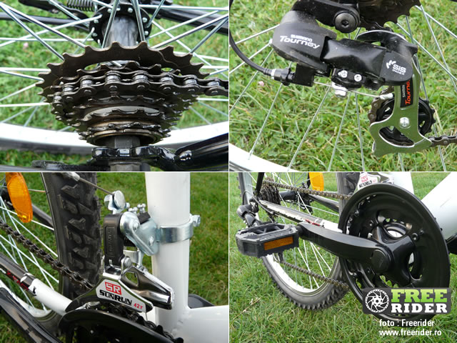 La nivel de transmisie, ne sunt oferite doar 6 pinioane, în situația în care standardul în domeniu este de 8 sau 9 pinioane. Foile sunt nituite, deci nu le vei putea demonta în cazul în care vrei să păstrezi doar două dintre ele. Schimbătoarele provin de la Shimano, iar acesta este un plus atunci când vine vorba de echiparea acestei biciclete. Există numeroase persoane pentru care brand-ul Shimano este garanția calității, făcând astfel din bicicletă o afacere bună. Schimbătorul de pinioane și manetele schimbătoarelor fac parte din gama Shimano Tourney. Dacă funcționalitatea schimbătorului de pinioane poate fi considerată decentă, nu același lucru se poate spune și despre cel de foi, SR SunRun (un brand ce aduce cu SR SunTour). Este imprecis, se acționează greoi și este zgomotos.