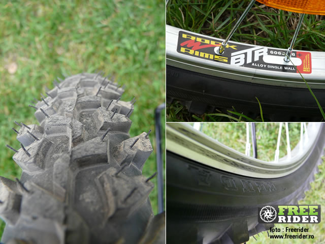 Intradevar nu m-am putut abtine si a trebuit sa vad cum merge prin padure si pe un teren de motocross…Va recomand sa NU incercati asa ceva niciodata pentru ca simtiti absolut orice denivelare pana in adancul oaselor. O a doua problema este ca valvele deja s-au taiat deoarece tot ce am avut la indemana in mijlocul padurii era o mini-pompa (camera a scapat dintr-o data tot aerul si va dati seama ce limbaj am folosit atunci…). Acum trebuie sa schimb si camera si as dori sa schimb si cauciucurile cu unele mai mari de 26 X 2.2 sau 26 X 2.00. Sper sa incapa.