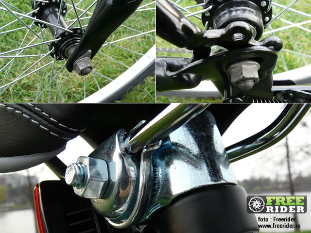 Dacă vine vorba de schimbarea unei camere în cazul unei pene de cauciuc, poți să uiți, dacă nu ai la dispoziție o cheie de 14/15. Roțile nu au cheiță de tip Quick Release pentru a putea fi demontate fără scule, ci sunt prinse cu șuruburi. Aceeași situație o întâlnim și în cazul prinderii șeii sau a tijei de șa: nu pot fi reglate decât cu ajutorul unei chei specifice.