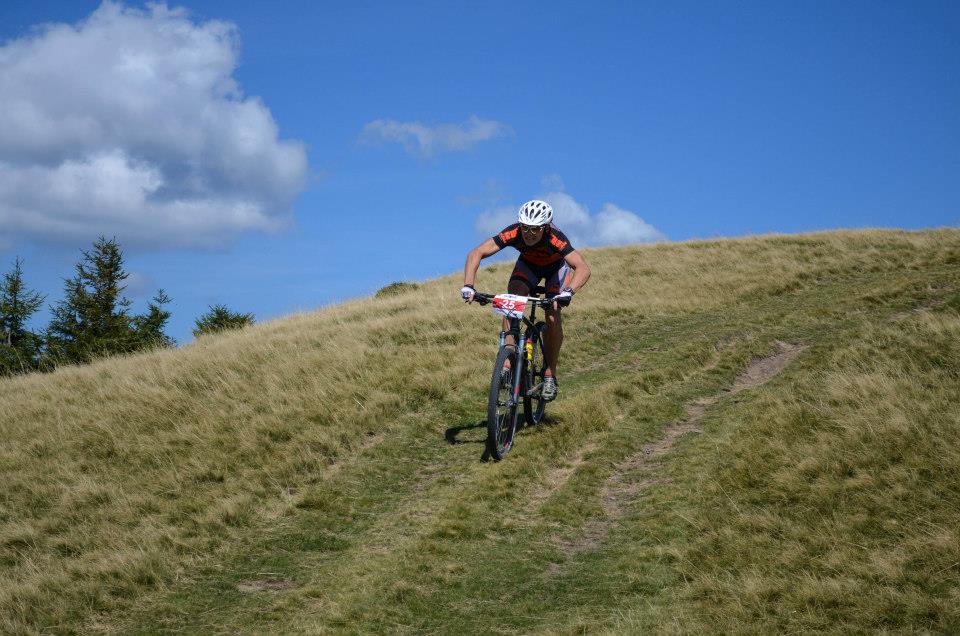 Poziţie de atac! Greutatea în pedale! Ia-ţi trasă, ia-ţi trasă! Cam astea au fost vorbele pe care le-am avut în cap, pe coborârea din Vârful Romanescu, de la 1.700 de altitudine, o coborâre pe care nu pot spune că m-au lăsat muşchii de la picioare, dar cu siguranţă aş fi vrut ca ei să fie mai puternici, pentru a încasa toate loviturile pe care ţi le dădea muntele! Dar, iarna e aproape, aşa că ocazia e perfectă pentru a ne pune la punct la acest capitol. Niciodată nu avem muşchii suficient de puternici! Iar în creastă, acolo unde vântul sufla aspru, am putut să merg o bucată de drum în cotă de nivel, încercând să fiu… cât mai relaxat. Plus că am descoperit noi moduri în care îţi poţi relaxa corpul pe o urcare dificilă, pentru că până în golul alpin am avut de parcurs o urcare forestieră extrem de interesantă, genul foaie mică-pinion mare, tehnică, toată numai echilibru şi relaxare, cu multe şleauri şi rampe foarte abrupte, care îţi mai dădeau când şi când un moment de respiro. Iar paznicul acestei urcări era o altă cunoştinţă de pe la curse, însuşi Ciprian Roşca, care, s-a întins mai întâi ostentativ – spun eu, pe spate, să văd bine că de fapt se poate să fii şi relaxat la munte, nu doar asudând pe bicicletă pe pragul anaerob, după care m-a anunţat pe ce loc sunt în categorie, atunci când m-a văzut sosind tras la faţă, mai de la vale, dintr-un fals plat. De menţionat că această zonă mi-a pus un mare zâmbet prin faţă şi am de declarat că am refuzat plasa unei maşini. Eram pe locul patru în categorie. Atât de aproape şi atât de departe. Din nou!