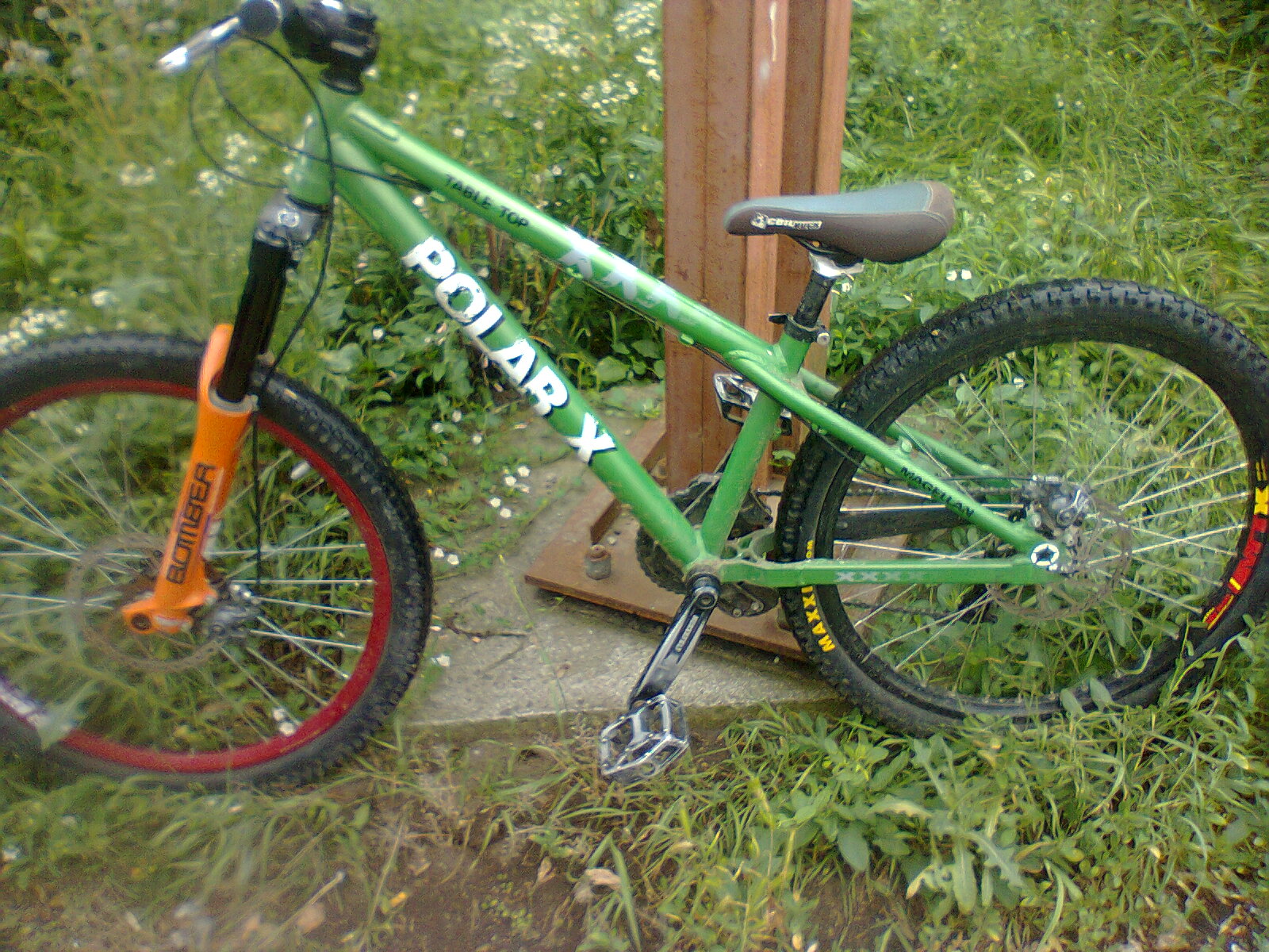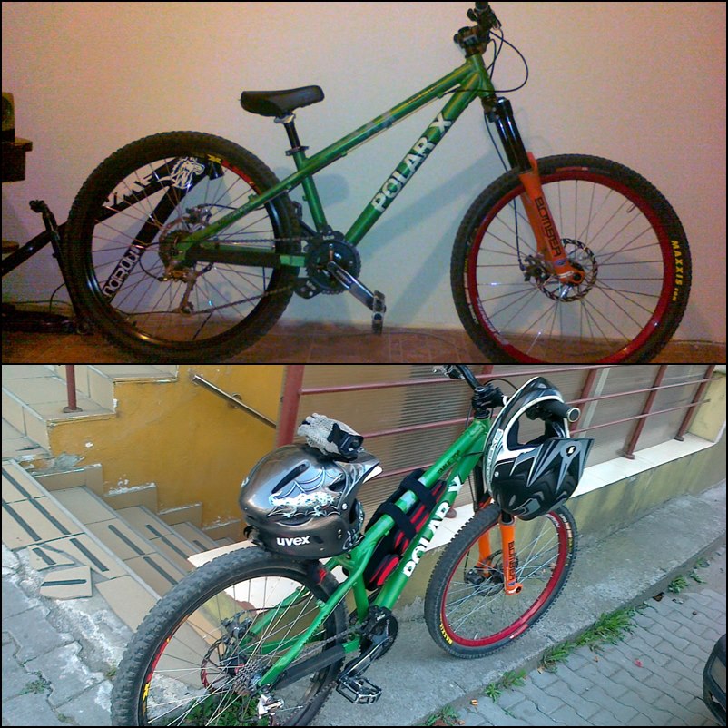 Atasez o imagine cu bicicleta, un Polar X table top (basic green), Marzo Z1 2006, modelul aniversar „ala fain cu portocaliu”, frane MX2, schimbator X7 2011, maneta de X9, angrenaj Hussfelt, jante MTX cu Maxxis Minion, respectiv Specialized F550 cu guma Maxxis Bling Bling Lopes. Cam asta in mare parte, intre timp mi-am facut o alta bicicleta, cea recuperata o tin drept amintire pentru suferinta si chinul prin care am trecut in tot timpul acela.