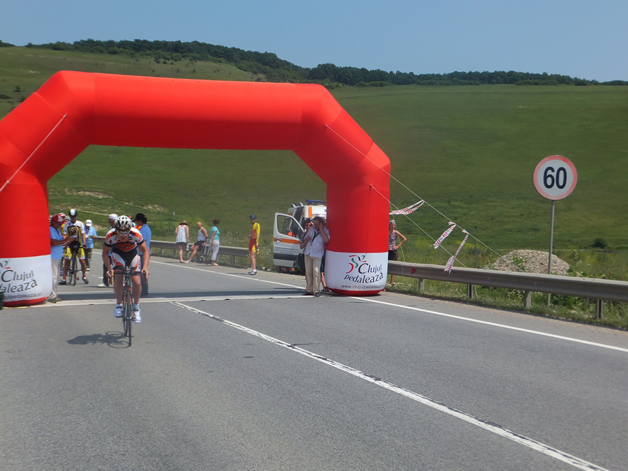 Într-adevăr, pasul mai lejer s-a simţit, în special pe prima parte a coborârii, unde nu am putut să pedalez, m-am ghemuit doar în poziţia de contra-timp, privind ciclocomputerul care arata puţin peste 70 km/h. Desigur, m-am ofticat după probă când am văzut că eram pe şase în categoria de vârstă, cred că am pierdut ceva timp cu schimbatul roţii şi ceva viteză cu pasul mai mic, dar nu am făcut nici o scenă dramatică, mai degrabă m-am bucurat că figurez în clasament, ar fi fost culmea să fi venit până la Cluj pentru 4 kilometri de pedalat. Din nou vă voi povesti despre Robike, care m-a primit la cortul lui şi mi-a pus un nou cauciuc pe spate, deoarece Ultremo îşi dăduse duhul prematur,fiind tăiat pe lateral.