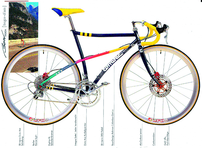 Corratec a avut în 1996 o idee care de abia astăzi a devenit realitate: construirea unei cursiere cu frâne pe disc. Aceasta avea o formă neconvențională pentru vremurile respective, seatstay-ul prelungindu-se până pe downtube și construită din două țevi asemeni modelului bow. Proiectul se pare că a fost prea costisitor din punct de vedere al costurilor, iar publicul încă nu era pregătit pentru a utiliza frâne pe disc pe o cursieră.