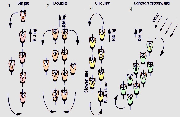 Pentru că cicliștii merg în pluton pentru a învinge rezistența vântului, aceștia trebuie să se alinieze în funcție de direcția sa. Scena din dreapta (a 4-a) a ilustrației de mai jos arată care este formația în care intră cicliștii dacă vântul bate din partea dreaptă. Totodată, dacă se merge într-un ritm mai relaxat, este posibil să se stea doi câte doi, iar dacă se merge într-un ritm foarte susținut, atunci se folosește o tehnică numită trena olandeză care presupune un schimb al trenei rapid, după doar câțiva zeci de metri de stat în față (scena 3).