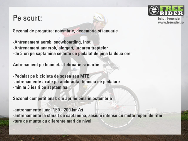 Nu pot să zic că mă pregatesc cu o luna înainte exclusiv pentru o anumită cursă, însă ating o formă destul de bună după participarea masivă la curse de șosea din prima jumătate a sezonului, forma pe care încerc să o păstrez cât mai mult. Pregătirea doar pentru anumite obiective de-a lungul unui sezon este încă un deziderat destul de greu de atins pentru ciclismul din România. Treaba e pe scurt în felul urmator: există sponsori diferiți pentru echipa de șosea și pentru cele de mountainbike și fiecare dintre aceștia dorește vizibilitate pentru brandul său în anumite curse care se succed cu destul de multă repeziciune ținând cont că totuși sunt două probe diferite pe care mă axez.