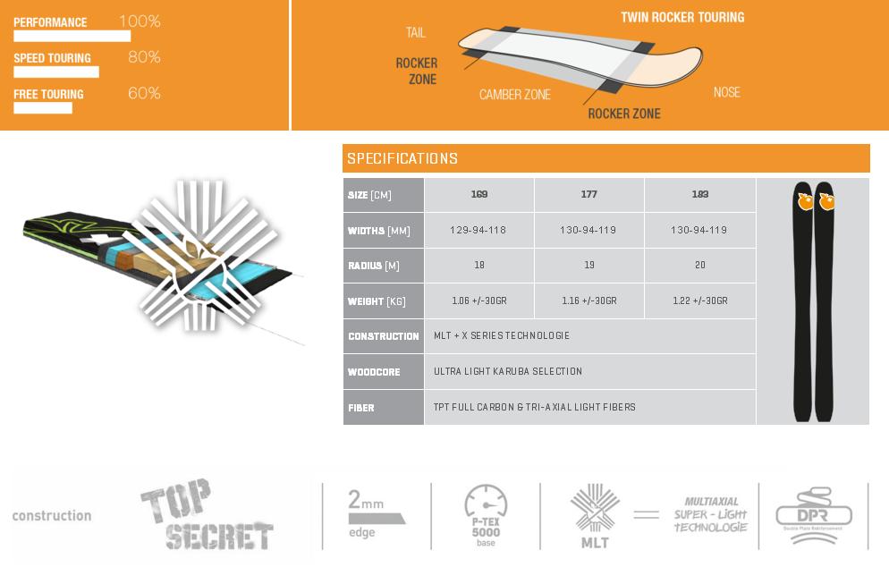 Modelul cel mai uşor de competiţie are dimensiunile de 96-66-90 mm şi o greutate de 670 g la lungimea de 160 cm, rază de 23 m şi o talpă ultra-rapidă din PTEX 5000. Camber-ul schiului este de tip clasic.