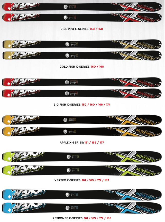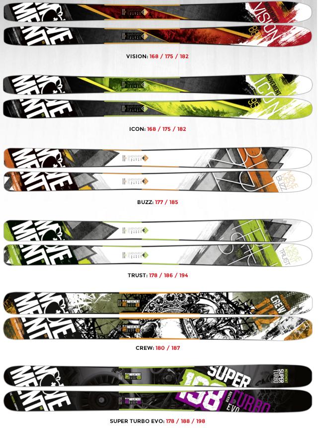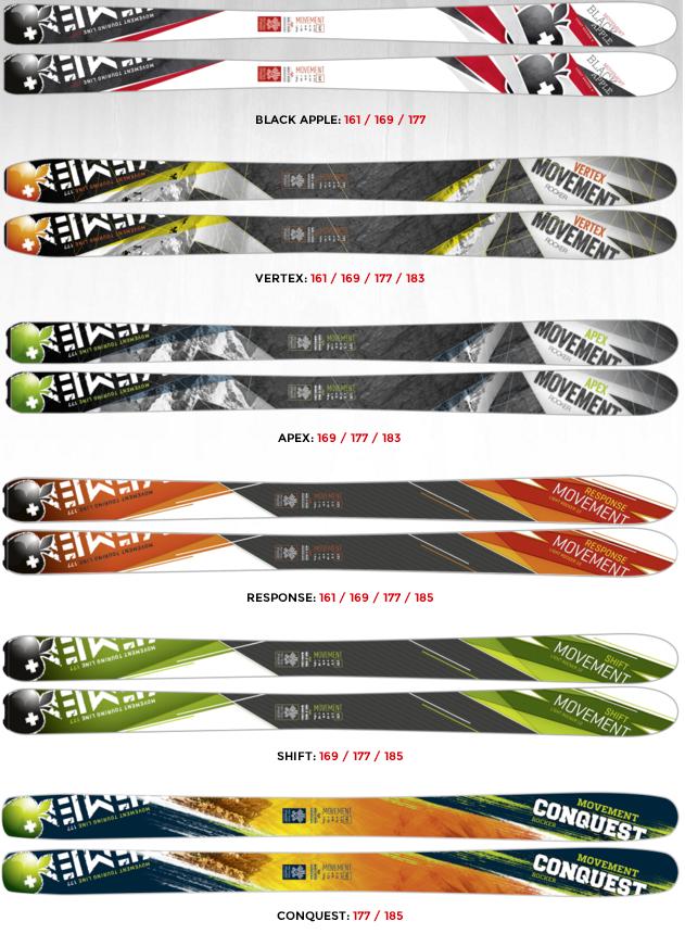 Pe lângă acestea, Movement Skis mai produce schiuri şi în gamele piste (pentru pârtie), backcountry (pentru trick-uri şi sărituri pe munte) şi Freestyle (pentru parc). De asemenea, multe dintre modelele din fiecare gamă au un model corespondent special conceput pentru femei. Tot de la Movement avem o gamă largă de accesorii: căşti, beţe, îmbrăcăminte de schi şi casual.