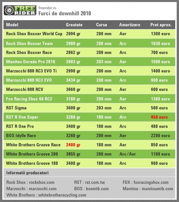 Dorim cu ocazia acestui articol sa trecem in revista si sa-ti prezentam, ofertele producatorilor de furci pentru segmentul downhill. In 2010, tendintele producatorilor sunt de a oferi produse mult mai durabile si mult mai usoare, comparativ cu anii precedenti. Cursa acestor furci a ramas constanta si se pastreaza in limitele anterioare, anume intre 180 mm si 200 mm.