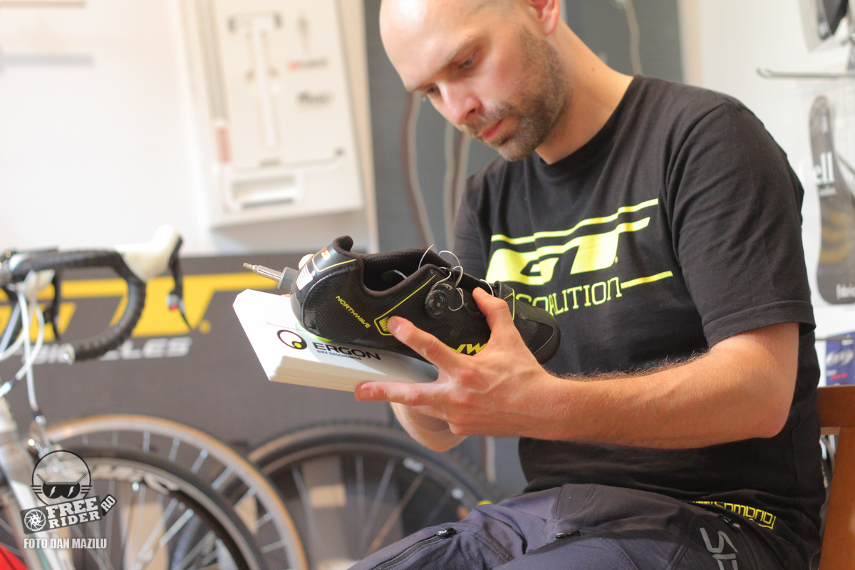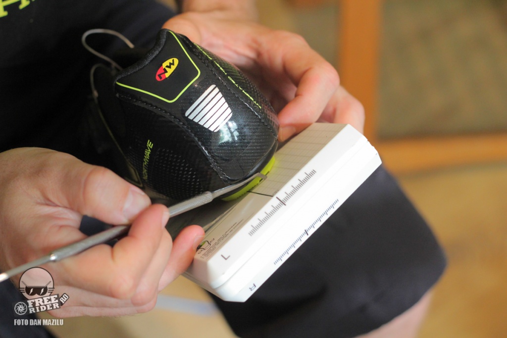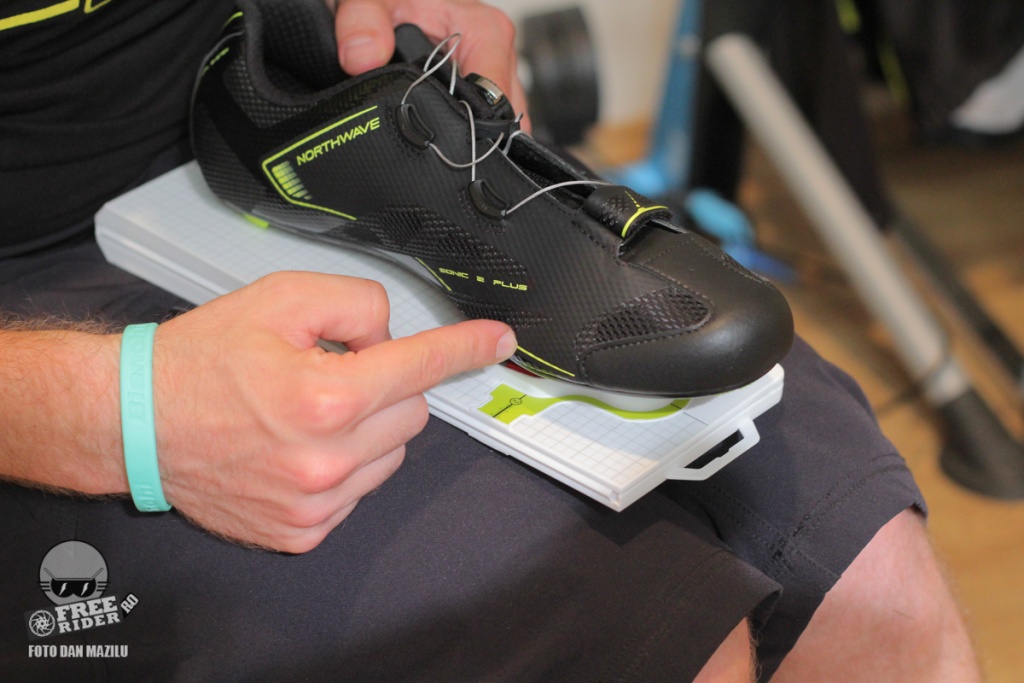 Apoi șablonul trebuie mișcat stânga-dreapta astfel încât călcâiul pantofului să fie ușor spre interior, spre bicicletă. Cât de mult spre interior ține de călcătura persoanei respective. Iar călcătura o poți afla făcând un bike fitting separat. Spokes oferă acest serviciu de bike fitting.