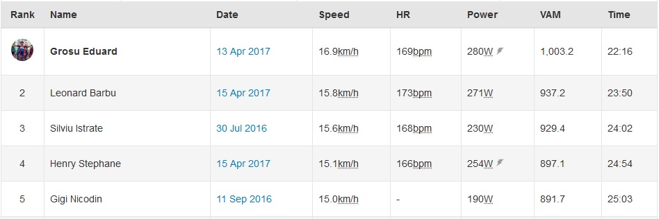 Segmentul de Strava are clasamentul de mai sus în momentul redactării articolului, pentru a lua KOM-ul trebuind să îl învingeți chiar pe Eduard Grosu! Succes!