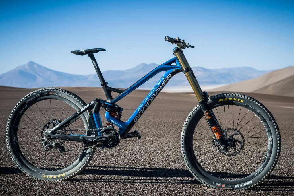 Elementul cel mai important este însă bicicleta Mondraker, un model pe care îl poate cumpăra oricine, cu foarte mici modificări, deşi preţul ei de peste 8000 Euro nu e mic. Mondraker-ul Summim Carbon Pro Team nu diferă mult de versiunea standard, foloseşte transmisia Saint, discuri de 203 mm, roţi DT Swiss XMC 1200 de 27.5 şi anvelope Maxxis Minion SSDH de 2.5. Suspensiile sunt standard, furca fiind un Fox 40 Float FIT iar amortizorul un DHX2. Şaua originală cu tija SDG şi ghidonul original Renthal Fatbar au fost păstrate. Au dispărut doar manetele de schimbător şi cablurile, complet inutile în situaţia asta.