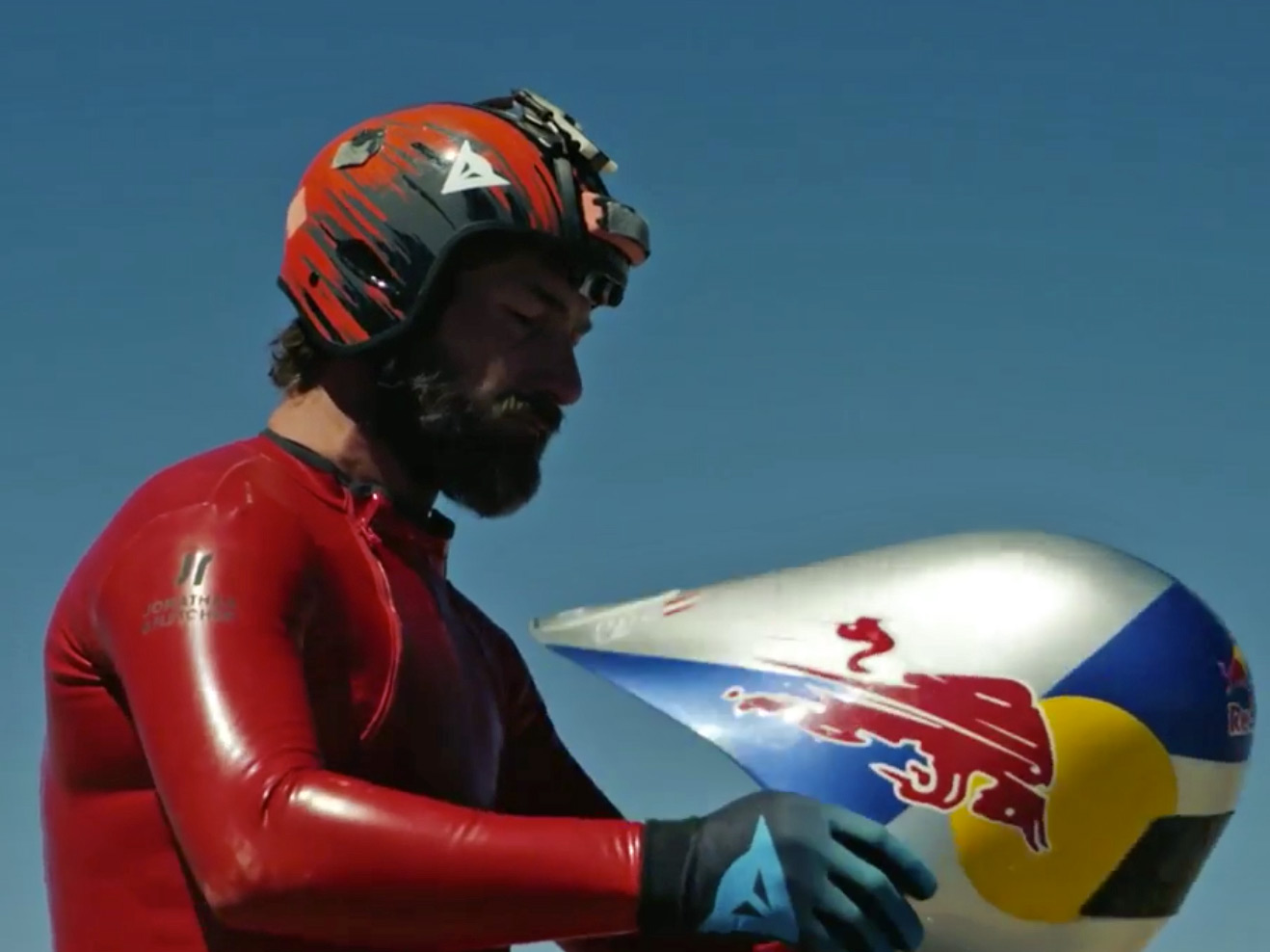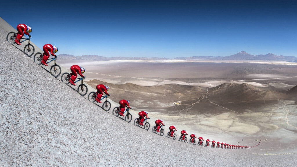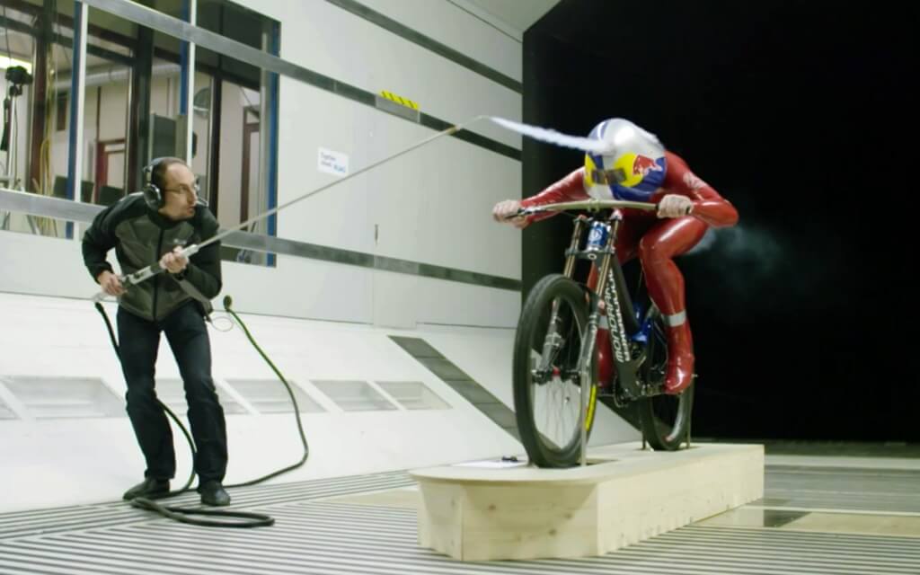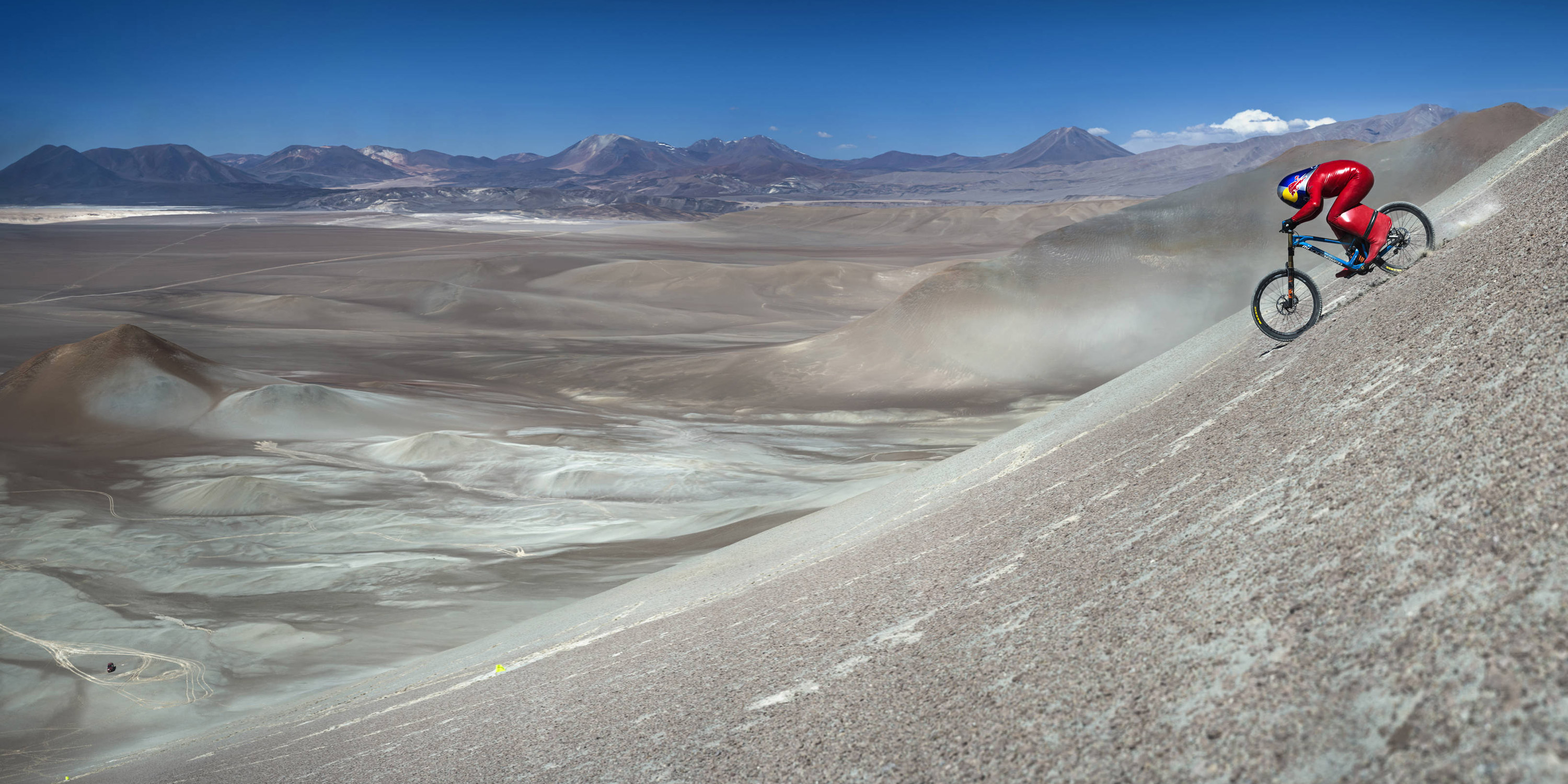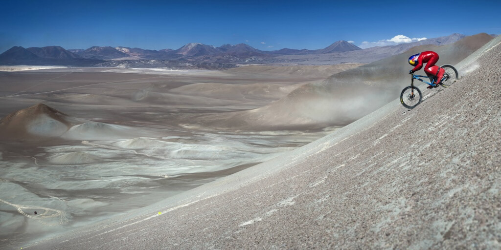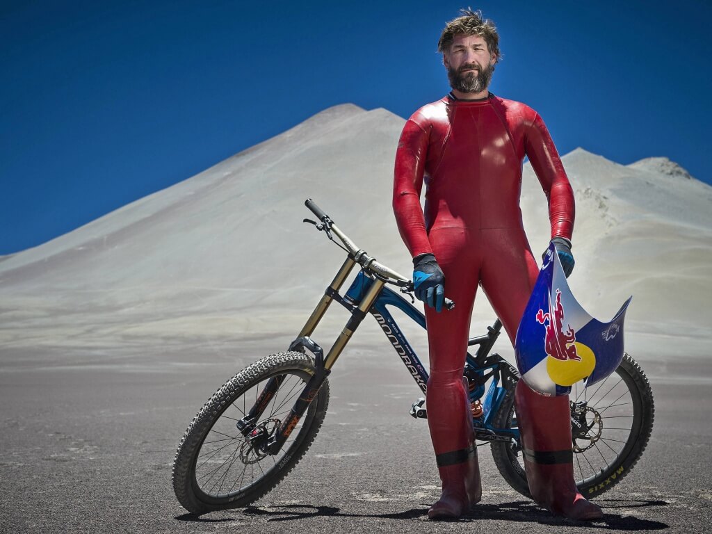 Coborârea a început la 4000 m altitudine, pe o pantă de 45 de grade, diferenţa de nivel fiind de 1200 m. El a parcurs această distanţă pe bicicleta Mondraker, îmbrăcat într-un costum aerodinamic roşu cu aripioare în spatele picioarelor şi cu o cască aero de-a dreptul interesantă.