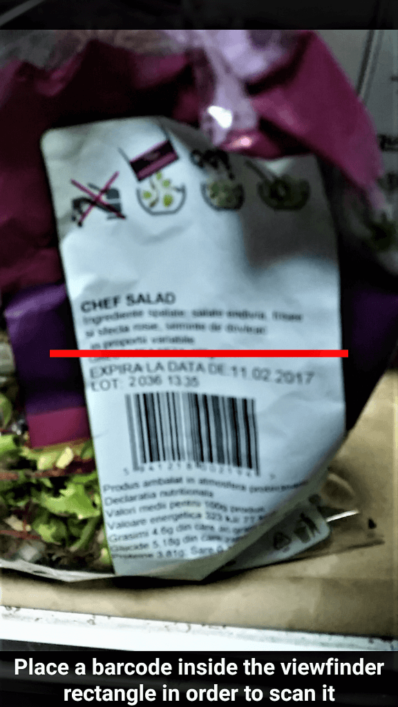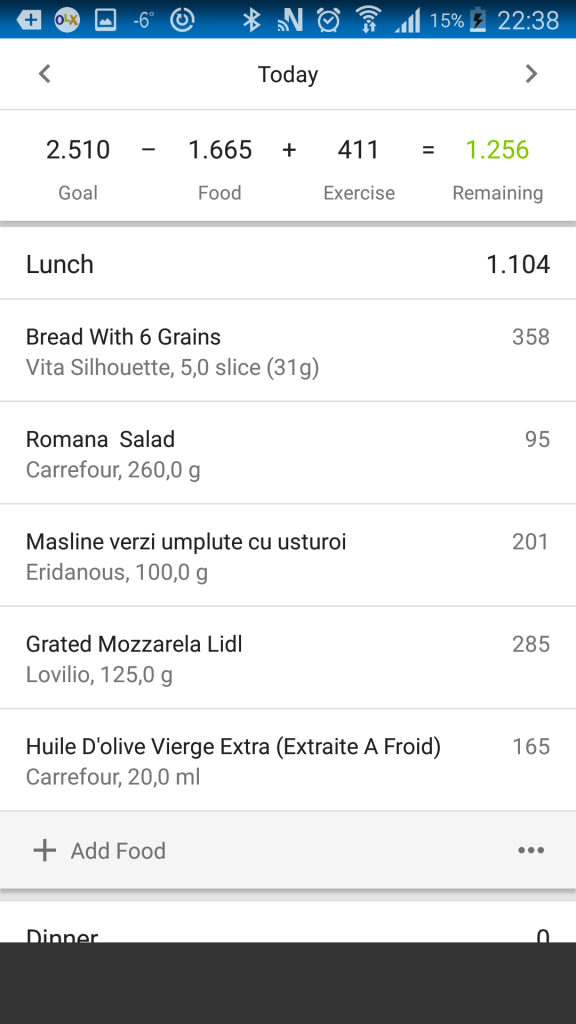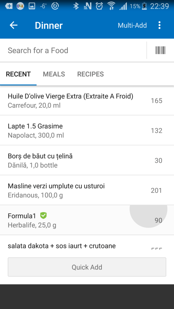 Introducerea alimentelor se face foarte eficient. Ele pot fi împărțite între micul dejun, prânz, cină și gustări. Se poate alege dintre alimentele și rețetele predefinite sau definite de alți utilizatori, putem introduce rețetele noastre proprii pe baza ingredientelor, putem introduce o cantintate de kcal consumate fără alte explicații, însă cea mai utilă funcție mi se pare cea de cititor de coduri de bare, cu care putem scana practic aproape orice aliment sau băutură disponibilă pe piață, obținând imediat informațiile complete nutriționale despre aceasta. Noi trebuie să actualizăm doar cantitatea! Încă nu am întâlnit nimic ce să nu fie detectat cu scanner-ul. Dacă serviți masa în oraș, restaurantele serioase ar trebui să aibă un meniu cu informații nutriționale, cele gen fast food au așa ceva și luați datele de acolo (Salad Box, Ikea, KFC, etc…)