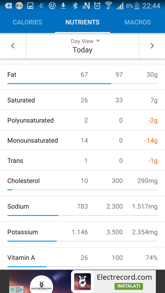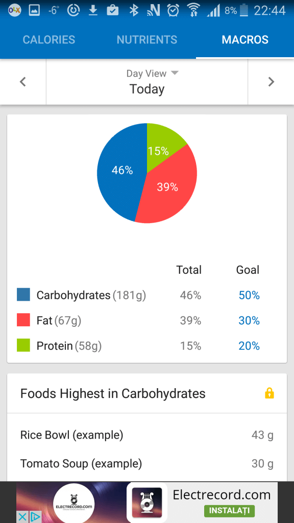Pe lângă informațiile despre kcal, programul mai oferă informații despre macronutrienți (grăsimi, proteine, glucide), procentul acestora în meniul zilnic și procentul recomandat. Varianta cu plată oferă informații mult mai multe, cum ar fi procentul de macronutrienți în fiecare produs, informații despre minerale și oligoelemente, plata fiind pe bază de abonament lunar sau anual (50,09 lei/lună sau de preferat 245,99 lei/an).