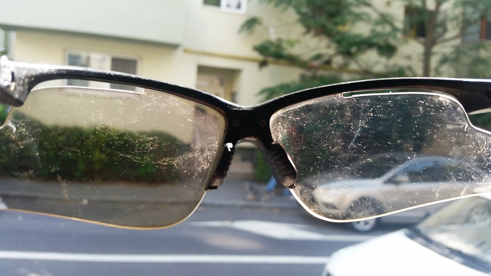 20150901_104559Am cumpărat o pereche de ochelari de soare destul de scumpi, cu lentilă heliomată, foarte comozi şi foarte performanţi. Am tras de ei la toate sporturile posibile vreo 2 ani de zile, după care, încet încet, parcă nu mai ieşea de pe ei murdăria la spălat. Rămâneau câteva pete albe, am bănuit că e transpiraţie uscată şi nu am insistat pe ea ca să nu zgâriu lentila.