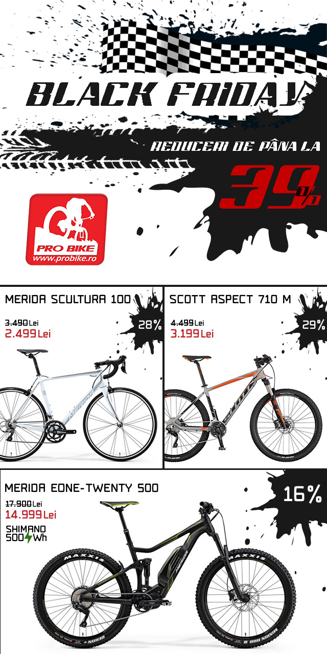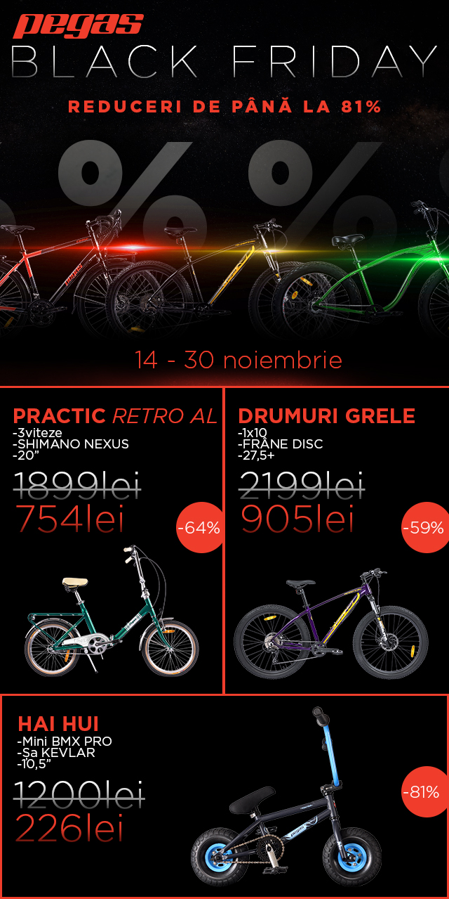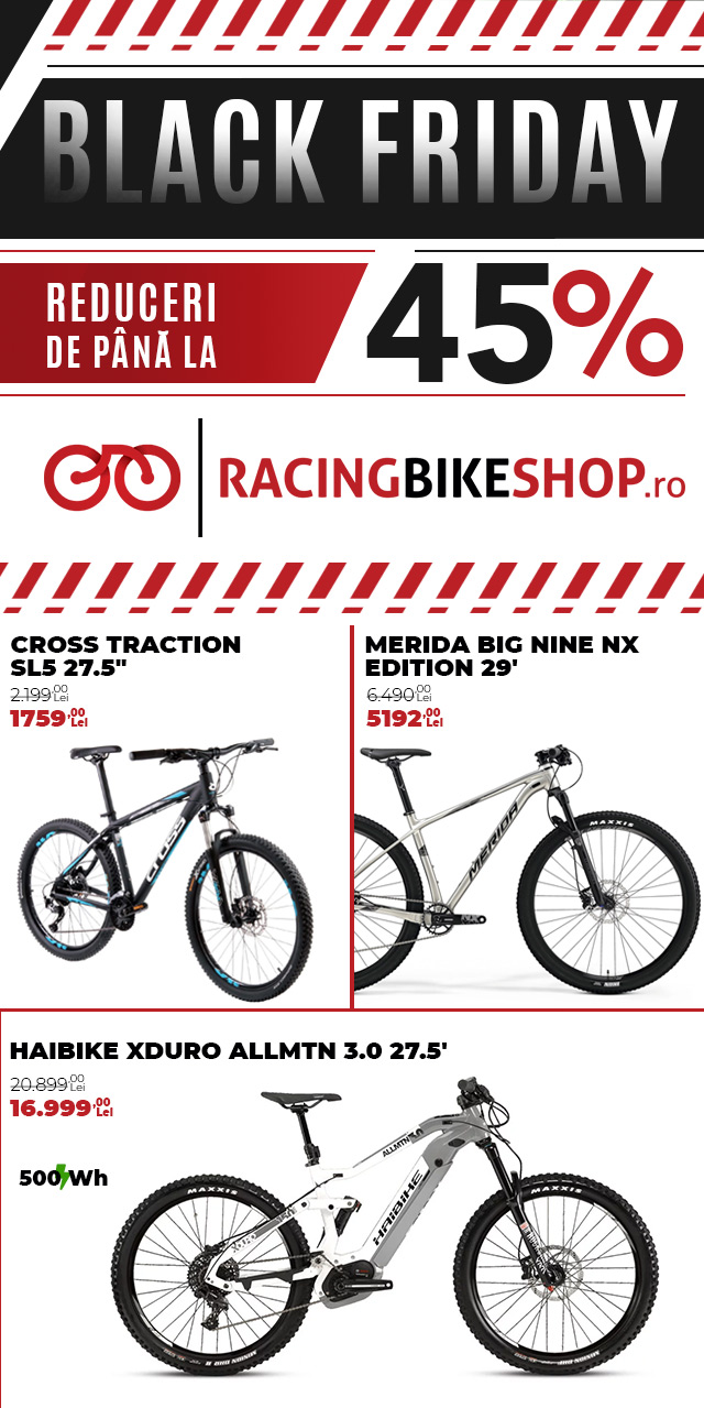 În foarte scurt timp se va da startul la reduceri de Black Friday pentru biciclete! Dacă unele dintre magazine au început reducerile consistente încă de la începutul lunii, alții se pregătesc pentru acest weekend. Și să nu uităm, că alte magazine vor continua promoția chiar până la finele lui noiembrie, în limitele stocurilor disponibile. Am colectat mai multe oferte de la magazine, pe care le-am primit pe adresa noastră de e-mail și vi le punem la dispoziție în cele ce urmează. Reducerile sunt mari, iar una dintre cele mai mari este de… 13.026 de lei, pentru o bicicletă. Vă invităm să vizionați ofertele expuse mai jos.