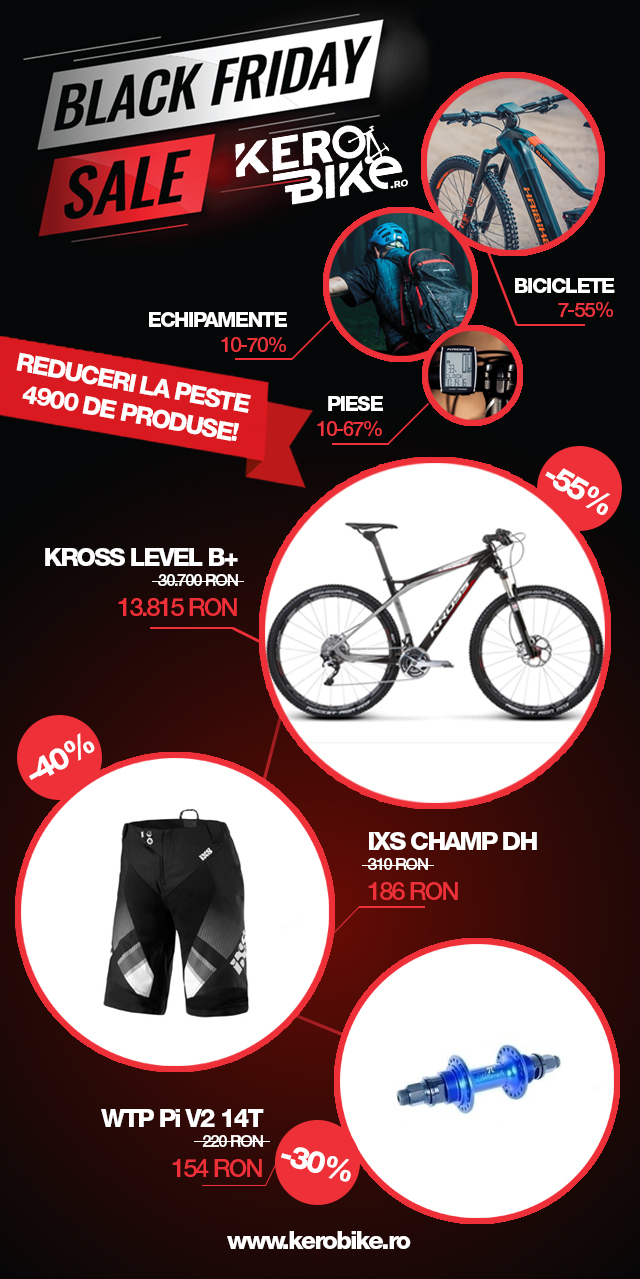 BikeServ din Brașov desfășoară promoția de Black Friday între 18 și 30 noiembrie 2019, cu reduceri mari pentru o serie de componente, accesorii și biciclete. Toate produsele aflate la reducere pot fi vizualizate pe această pagină.