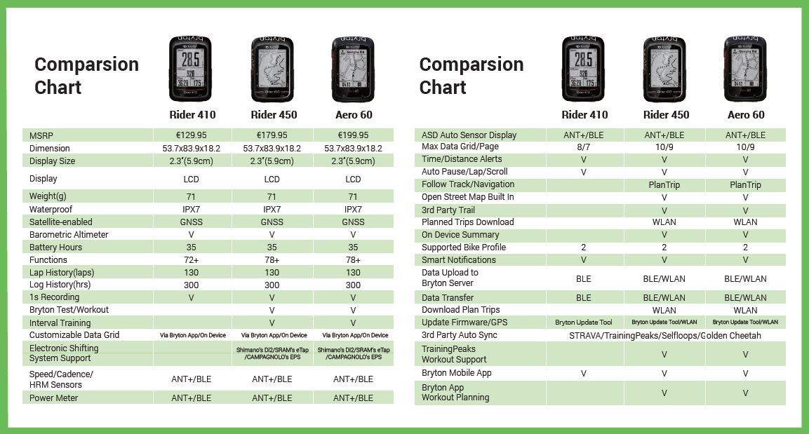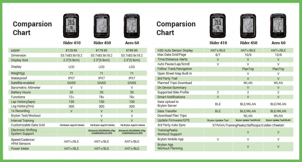 Echipa care lucrază la Bryton este foarte experimentată, aducând experiență de la Magellan, Mio, MiTac și Navman. Ultimele trei modele includ acum multe opțiuni în plus. Spre exemplu Aero 60 și Rider 450 folosesc Openstreetmap pentru navigație și pot fi „legate” cu Training Peaks pentru antrenamente. Întrucât hărțile sunt integrate, modelul Rider 410 nu se bazează pe legătura cu telefonul, așadar și bateria va ține mai mult.