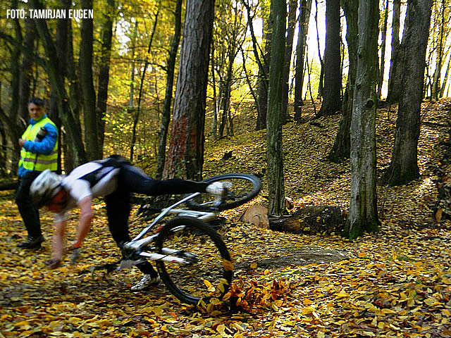 Fiţi pe pace căci nu o să descriu toate virajele, emoţiile şi semnalele de alarmă venite din străfundurile organismului care m-au încercat pe întortocheatul circuit pregătit de organizatori, deşi acesta a fost atât de antrenant încât sunt extrem de tentat să o fac… Ok, hai să pomenesc totuşi de ieşirea de pe podeţul de lemn, prin şant pe aleea de asfalt, rădăcinile de la stăvilar, ochii căscaţi pentru covorul de frunze alunecoase şi desigur, zona cea mai vânată de fotografi, treptele, pe care am reuşit să le abordez foarte „matur”, fără să îmi asum riscuri inutile.Păcat însă că la coborârea cu „şanţ”, cea unde exista şi o buclă în traseu, deşi nu eram presat de nimeni, am decis că mergeam prea încet şi am încasat o trântă cum numai la pubertate am mai reuşit, bicicleta mi-a aterizat pe spate, crăpându-mi ecranul mobilului de serviciu şi chiar mai grav, un gel de 10 lei bucata. Din fericire am scăpat intact, dar când să plec mai departe am constatat cu groază că aveam cablurile de la frâne şi schimbător înfăşurate în mod straniu în jurul headtube-ului. Am tras eu o vreme de ele, neputincios, gata să izbucnesc în plâns, ca un copil rămas fără jucărie, dar din fericire, domnul Eugen Tămârjan, care a surprins şi un foarte interesant instantaneu cu isprava mea, a propus să operăm puţin cu o cheie inbus. Scot o nouă „ancoră” din marsupiul de care nu mă despart la curse, un multi-tool şi privesc uimit cum domnul Eugen descurcă situaţia, la propriu şi la figurat. Fără dânsul eram pierdut, aşa că îi adresez un mare mulţumesc!
