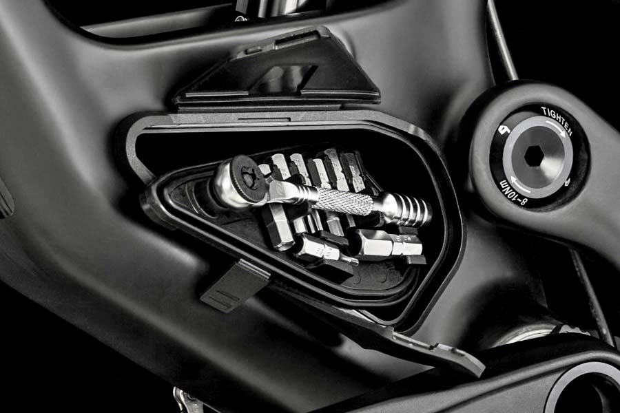 Noul cadru din carbon hi-mod vine cu un spațiu de depozitare sub prinderea inferioară a amortizorului unde pot fi păstrate câteva scule. Noul Stashbox vine deja cu câteva scule, respectiv o mică cheie cu capete imbus de 2, 2.5, 3, 4, 5, 6 și 8 mm precum și Torx T25, prinsă pe capacul cutiei. Mai rămâne loc pentru o cameră de rezervă sau altceva de dimensiune similară.