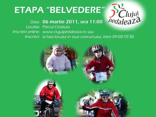 Toți cei dornici de sport și mișcare sunt așteptați duminică, 6 Martie 2011 la etapa Belvedere din competiția Clujul Pedalează. Oricine poate lua parte la competiție, indiferent de bicicleta pe care o deține! În plus, organizatorii s-au gândit la toți potențialii participanți și au creat categoriile de participare astfel încât oricine se va descurca să termine cu succes cursa. Iar distracția va fi pe măsură!