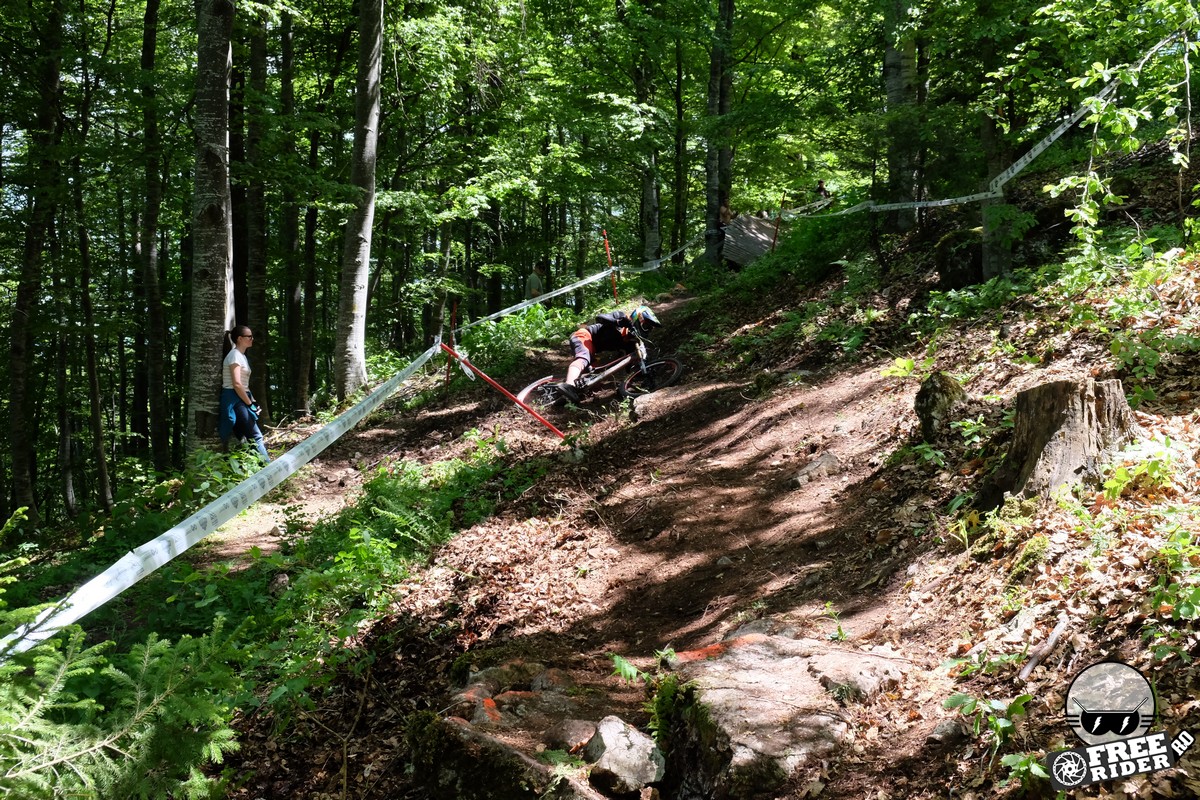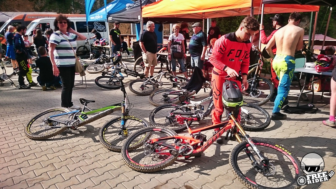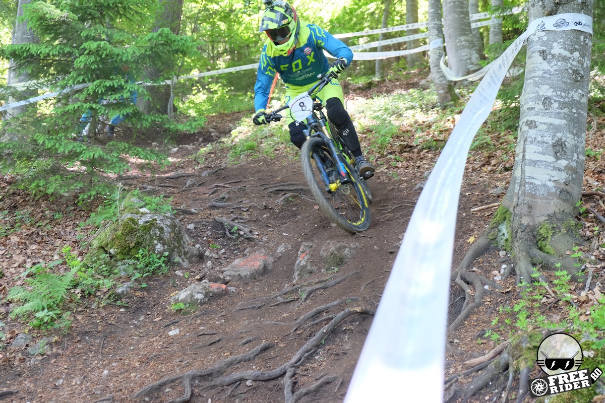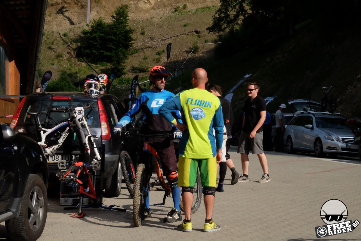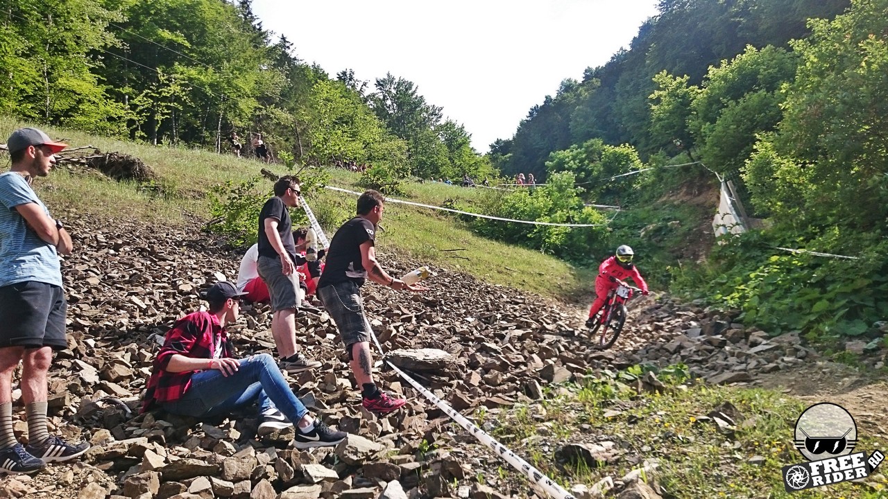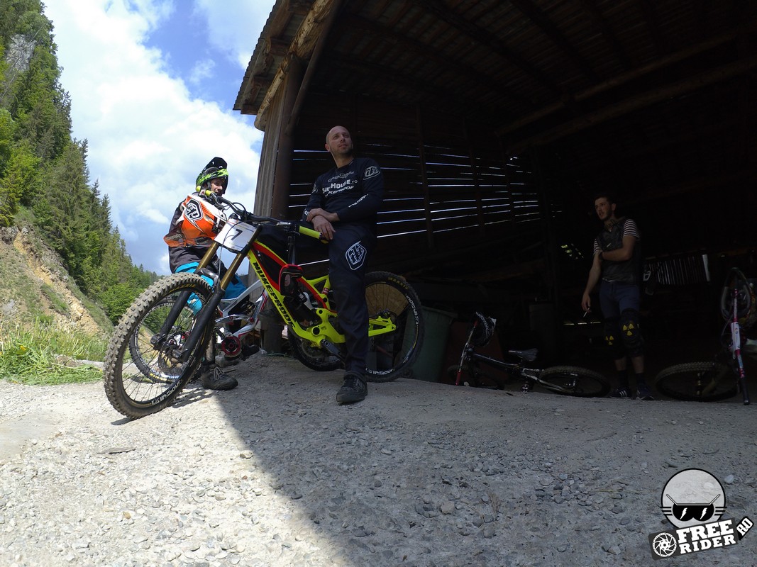 Revenind la concurs, ziua de sâmbătă a fost dedicată antrenamentelor, iar cele 6 ture pe care le-am dat m-au ajutat să mă familiarizez cu noul traseu. Nu a fost vorba despre unul radical schimbat, însă a fost mai lat, mai tehnic și mult mai intens. În cei 1.4 kilometri de coborâre nu aveai timp să respiri, nici să te odihnești, căci lucrurile se defășurau de regulă în această ordine: pietre, rădăcini, săritură, contrapantă, off-camber, wall-ride, pietre, praguri, drop, contrapantă, pietre mai mari, viraj strâns, viraj foarte strâns, duble, sărituri și tot așa. Înțelegeți voi. Deja după a 5a tură mă simțeam destul de epuizat, conștient fiind la rându-mi că downhill-ul nu este disciplina mea forte și nici una pentru care să mă antrenez consecvent. Dar dacă eu, în calitate de amator, pot să parcurg acest traseu, însemnă că-s mai mulți care pot încerca măcar o dată această experiență. Pentru că downhill-ul nu trebuie subestimat: pe cât de dificil, pe atât de dependent devii de el. Și chiar rapid.