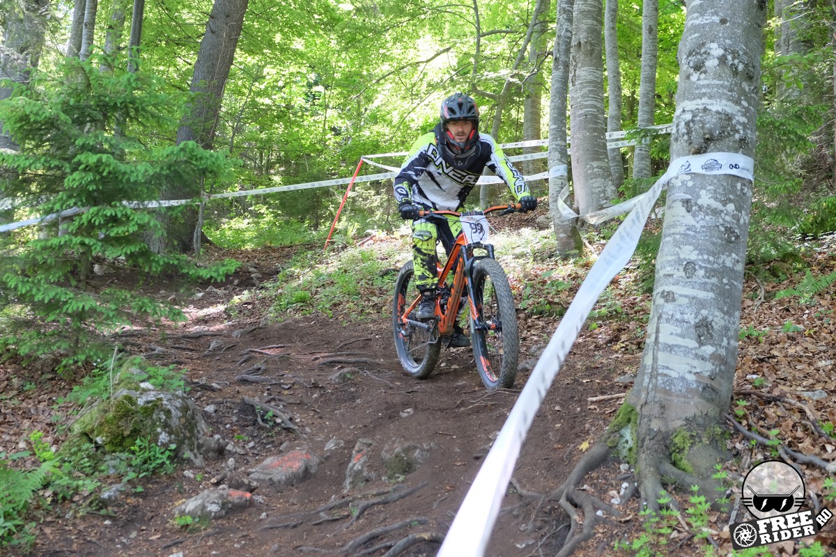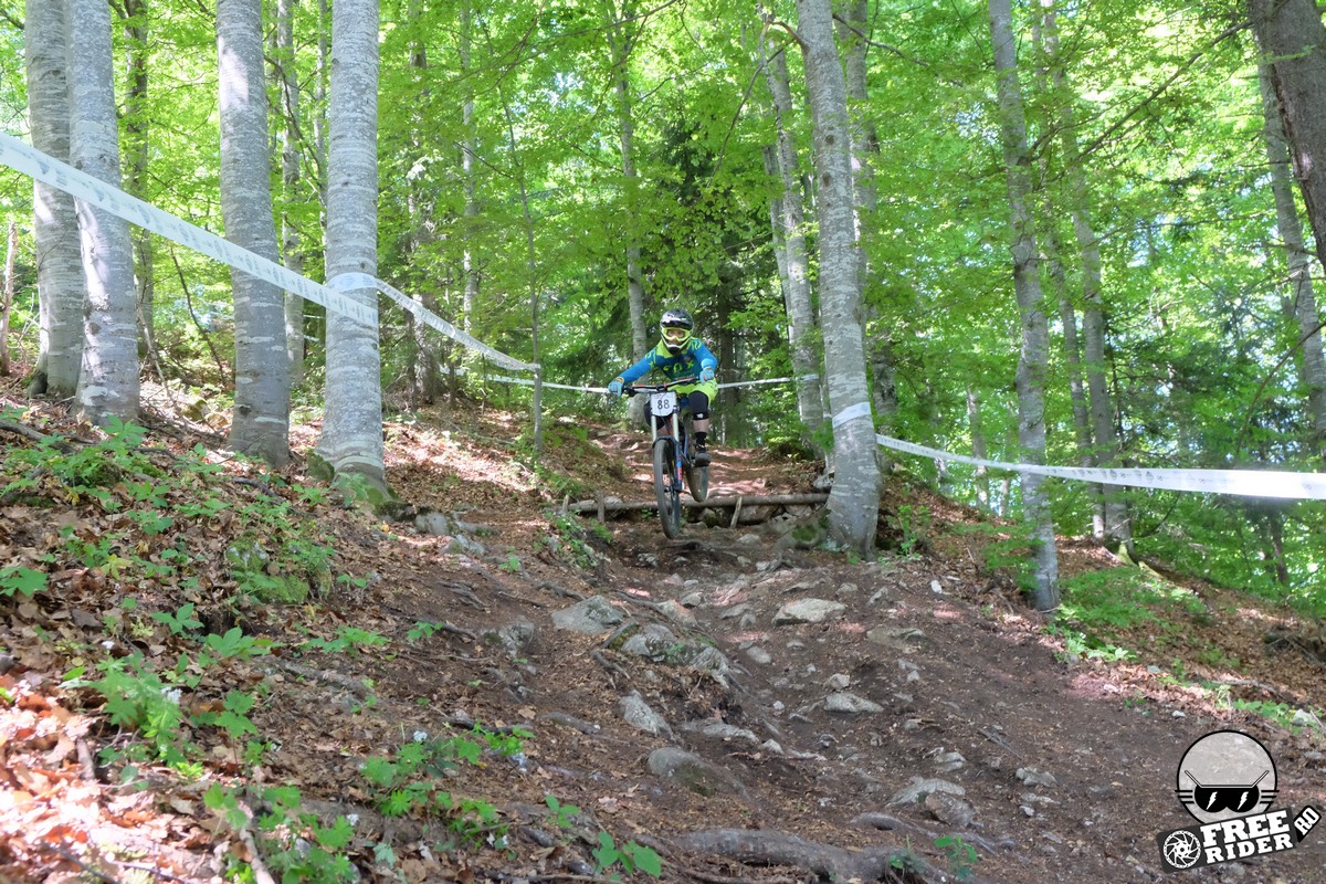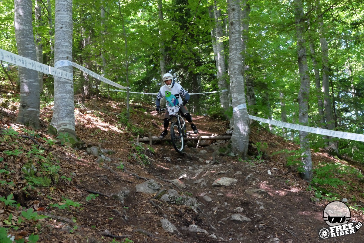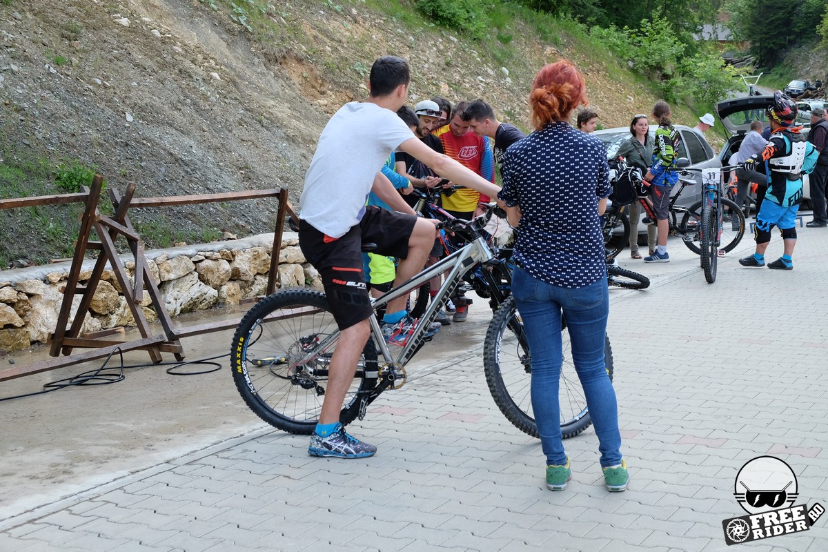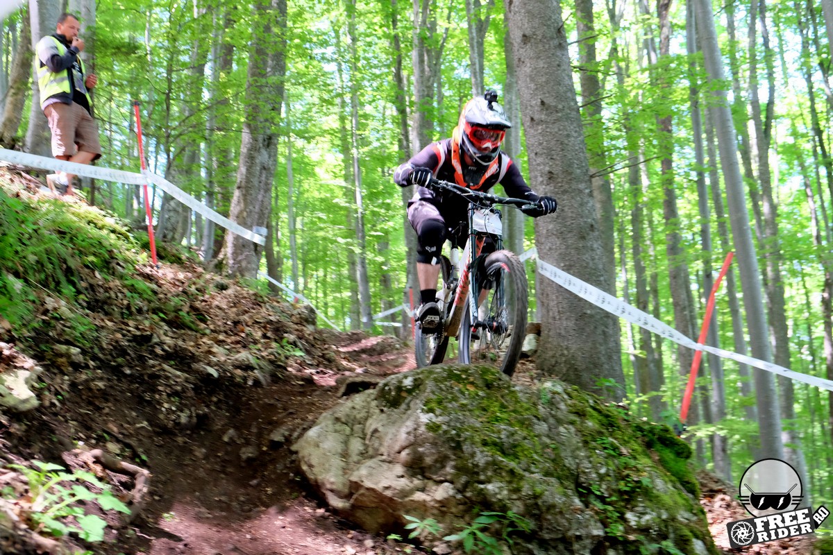 Revenind la concurs, ziua de sâmbătă a fost dedicată antrenamentelor, iar cele 6 ture pe care le-am dat m-au ajutat să mă familiarizez cu noul traseu. Nu a fost vorba despre unul radical schimbat, însă a fost mai lat, mai tehnic și mult mai intens. În cei 1.4 kilometri de coborâre nu aveai timp să respiri, nici să te odihnești, căci lucrurile se defășurau de regulă în această ordine: pietre, rădăcini, săritură, contrapantă, off-camber, wall-ride, pietre, praguri, drop, contrapantă, pietre mai mari, viraj strâns, viraj foarte strâns, duble, sărituri și tot așa. Înțelegeți voi. Deja după a 5a tură mă simțeam destul de epuizat, conștient fiind la rându-mi că downhill-ul nu este disciplina mea forte și nici una pentru care să mă antrenez consecvent. Dar dacă eu, în calitate de amator, pot să parcurg acest traseu, însemnă că-s mai mulți care pot încerca măcar o dată această experiență. Pentru că downhill-ul nu trebuie subestimat: pe cât de dificil, pe atât de dependent devii de el. Și chiar rapid.