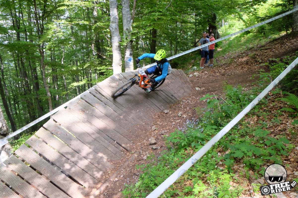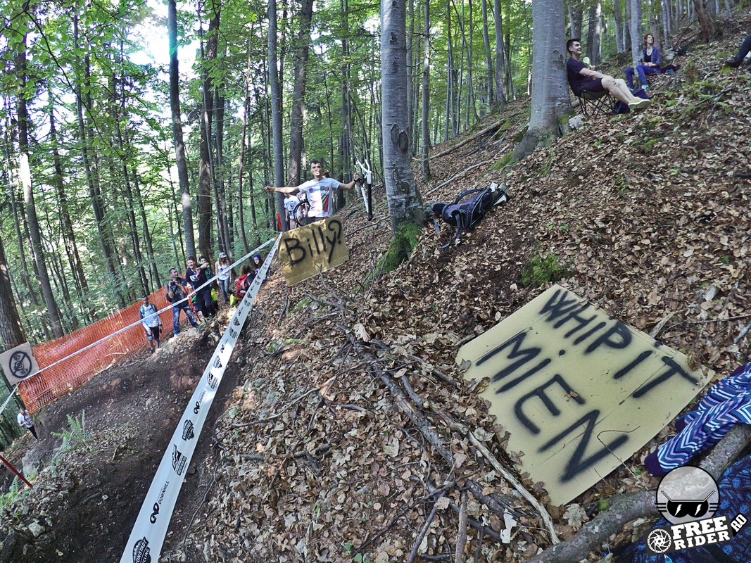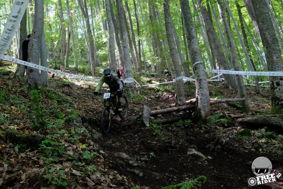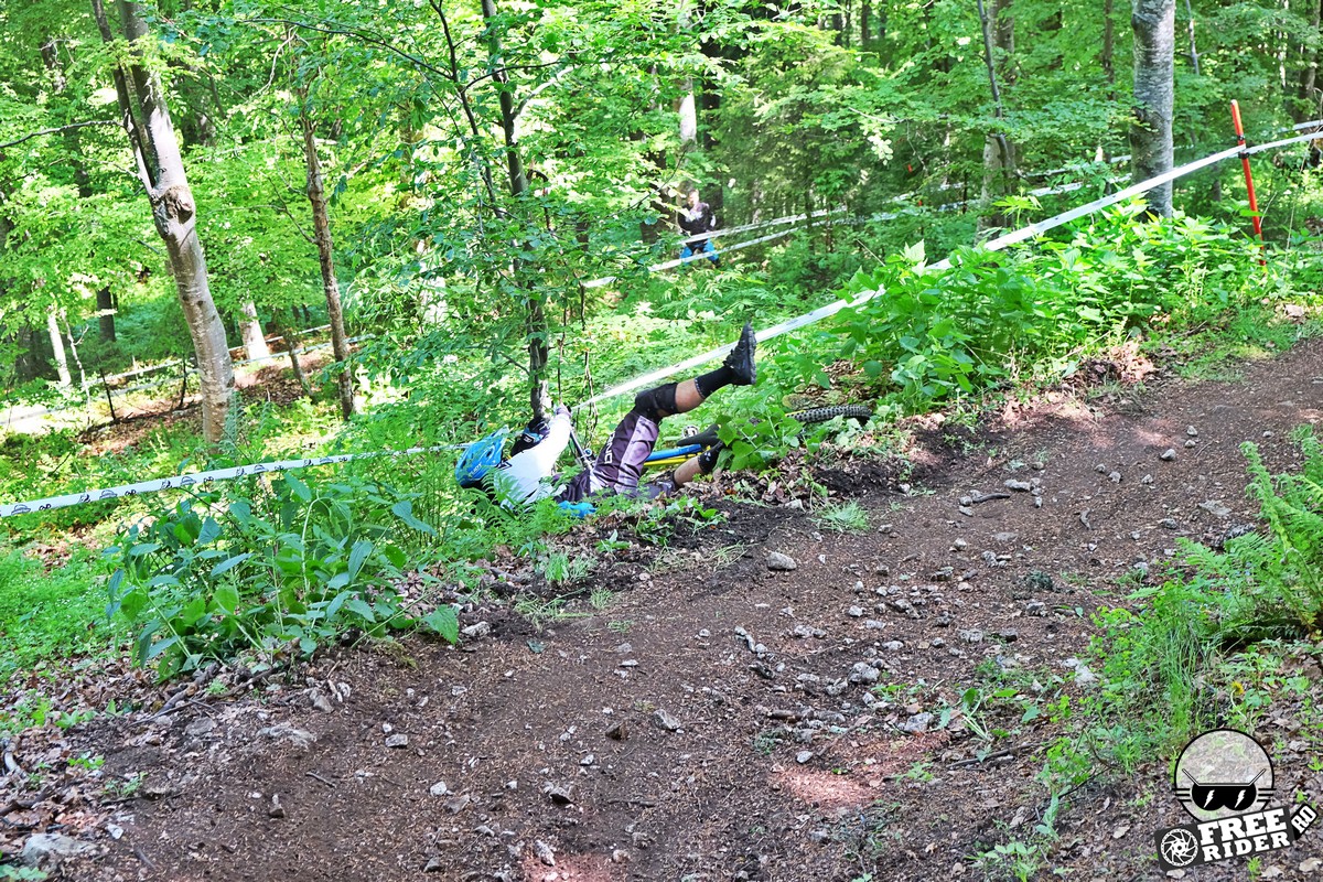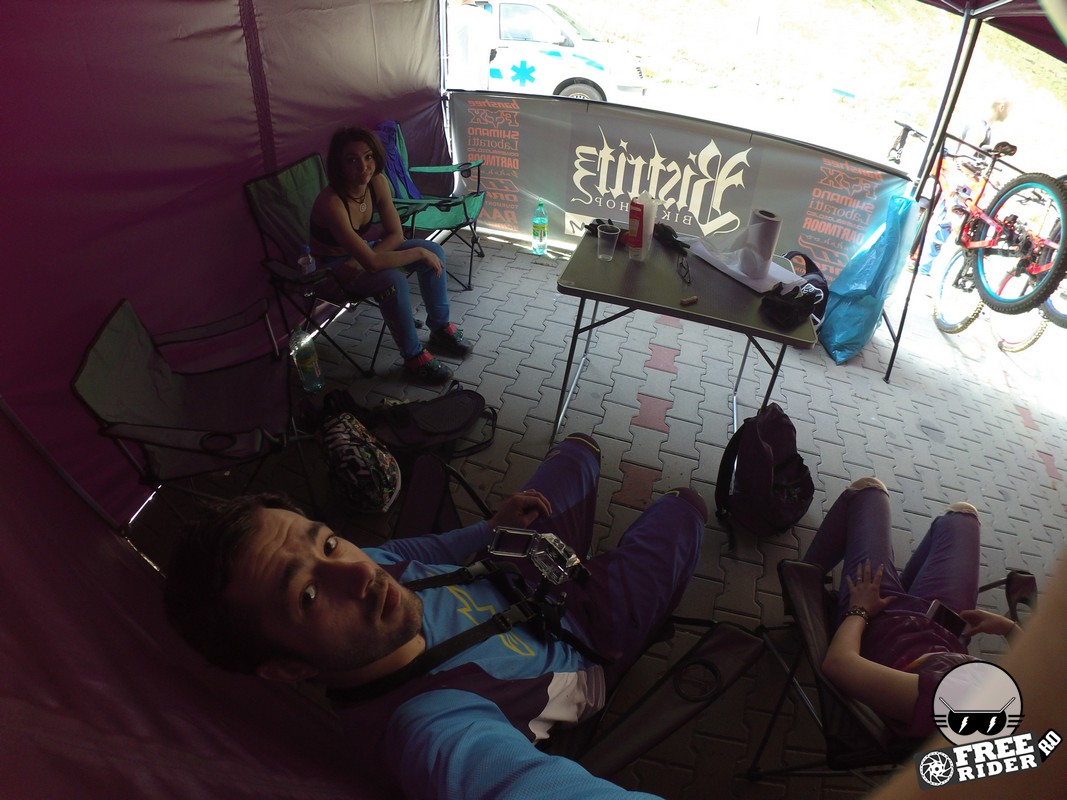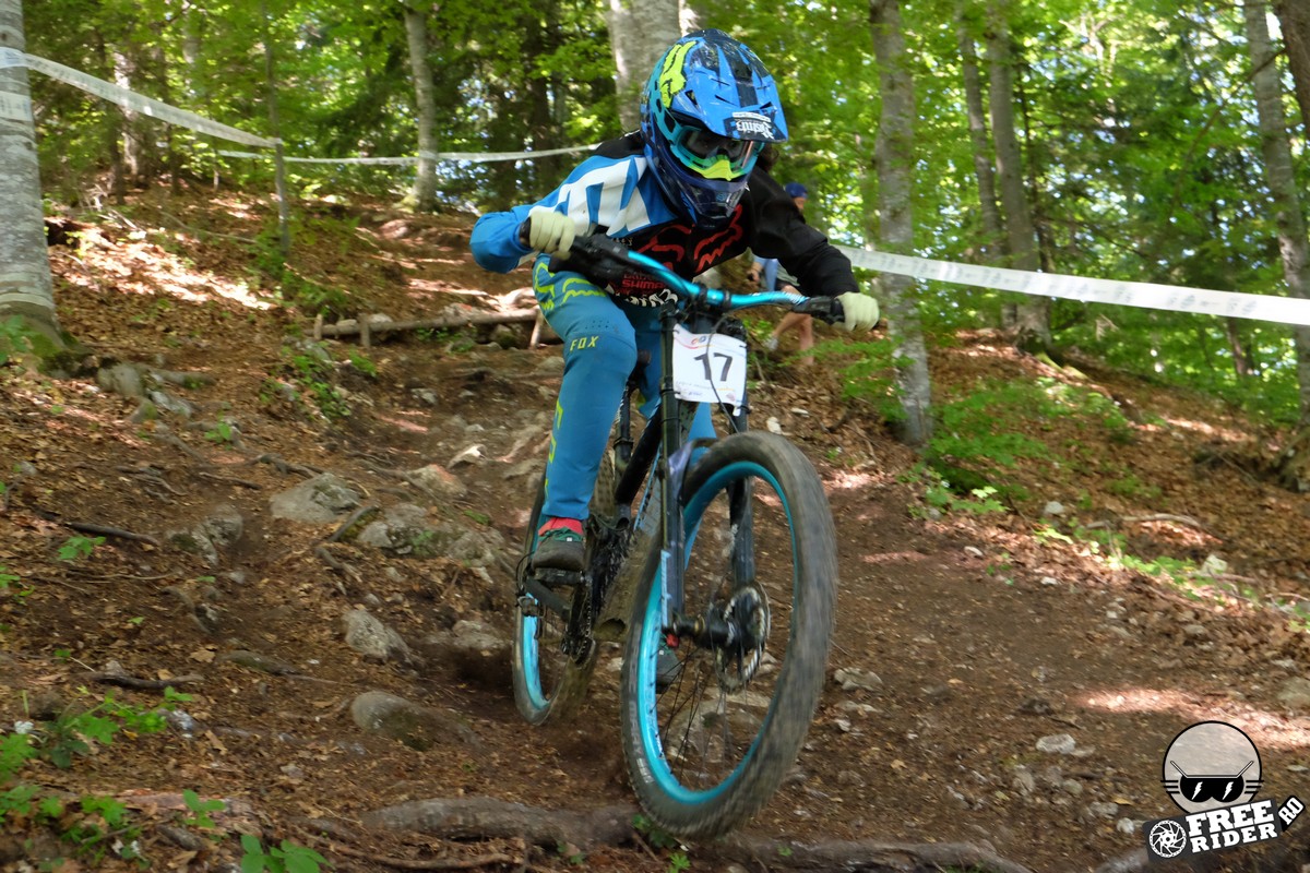 Revenind la concurs, ziua de sâmbătă a fost dedicată antrenamentelor, iar cele 6 ture pe care le-am dat m-au ajutat să mă familiarizez cu noul traseu. Nu a fost vorba despre unul radical schimbat, însă a fost mai lat, mai tehnic și mult mai intens. În cei 1.4 kilometri de coborâre nu aveai timp să respiri, nici să te odihnești, căci lucrurile se defășurau de regulă în această ordine: pietre, rădăcini, săritură, contrapantă, off-camber, wall-ride, pietre, praguri, drop, contrapantă, pietre mai mari, viraj strâns, viraj foarte strâns, duble, sărituri și tot așa. Înțelegeți voi. Deja după a 5a tură mă simțeam destul de epuizat, conștient fiind la rându-mi că downhill-ul nu este disciplina mea forte și nici una pentru care să mă antrenez consecvent. Dar dacă eu, în calitate de amator, pot să parcurg acest traseu, însemnă că-s mai mulți care pot încerca măcar o dată această experiență. Pentru că downhill-ul nu trebuie subestimat: pe cât de dificil, pe atât de dependent devii de el. Și chiar rapid.