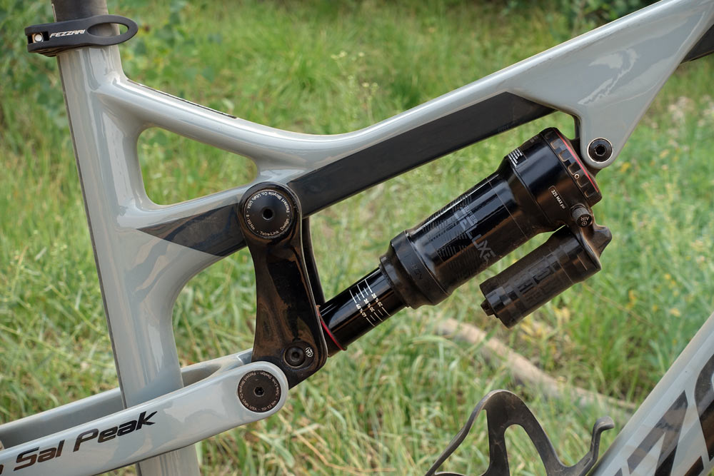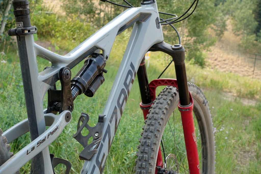 Bicicleta e disponibilă doar cu cadru din carbon pentru că asta e ce își doresc și producătorii și piața. De-a lungul anilor și-au îmbunătățit sistemul de stratificare a carbonului cu fibre mai lungi pentru a reduce suprapunerile, ceea ce înseamnă o greutate mai mică. Ei spun că au reușit să scadă 300 g din greutatea cadrului, la aceiași mărime, față de ce făceau acum câțiva ani. Greutatea cadrului La Sal Peak e de 2.300 g fără amortizor, în mărimea M.