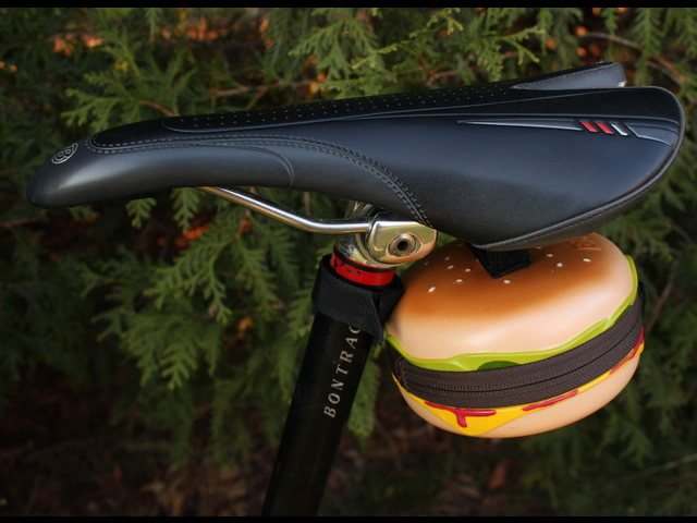 Din lungul șir de accesorii de care nu vei avea niciodată nevoie, am ales această geantă care se montează sub șa și se prezintă sub formă de hamburger.