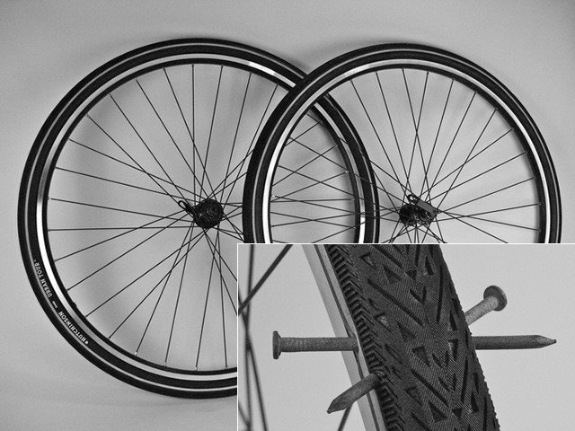 Da, am scris bine mai sus. Nu vei mai face pană. Steve Boehmke, un activ membru al comunității de bicicliști din Los Angeles, a dezvoltat împreună cu cei de la Hutchinson niște anvelope care nu se dezumflă indiferent în cât de multe puncte sunt găurite de diferite obiecte ascuțite, precum cuie sau cioburi. Pentru explicații mai pe-ndelete, te invităm să vizionezi filmul de mai jos. Ideea de bază este că aceste anvelope, a căror secret nu este dezvăluit, sau cel puțin nu în întregime, sunt greu de montat pe roți și chiar necesită un set special de jante. Acesta este motivul pentru care există @cme FlatFree Wheelset, perechea de roți pe care sunt instalate direct aceste anvelope.