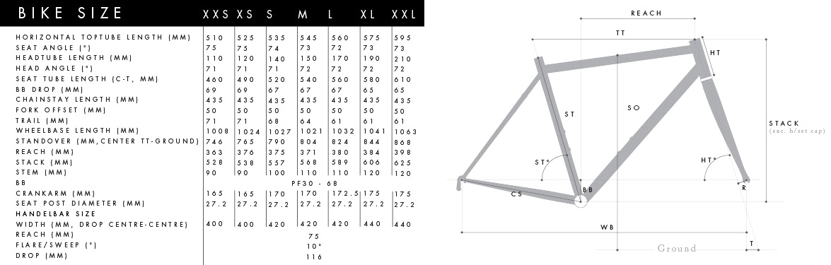 Noua bicicletă din carbon are o geometrie puțin modificată față de modelul din oțel, cu un reach ceva mai mic și o poziție ceva mai înaltă și mai confortabilă. Interesant e că versiunea din carbon e disponibilă în 3 mărimi noi, acoperind acum gama XXS-XXL.