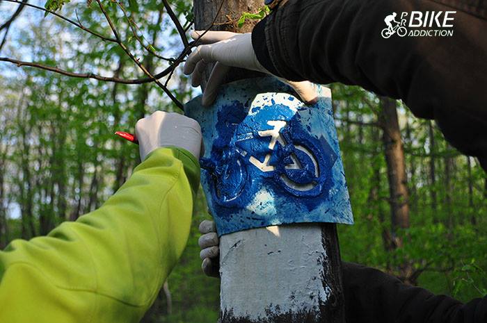 Marcaj: pictogramă bicicletă albastră pe fond alb, sageti de ghidaj albastre