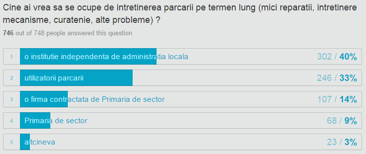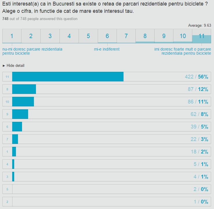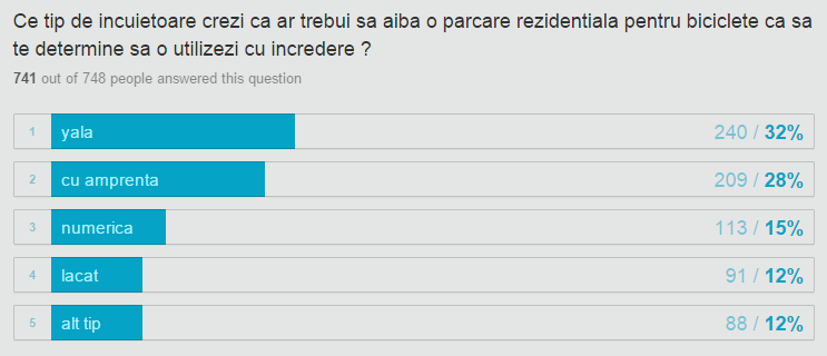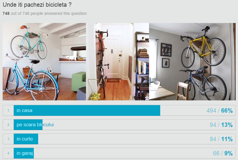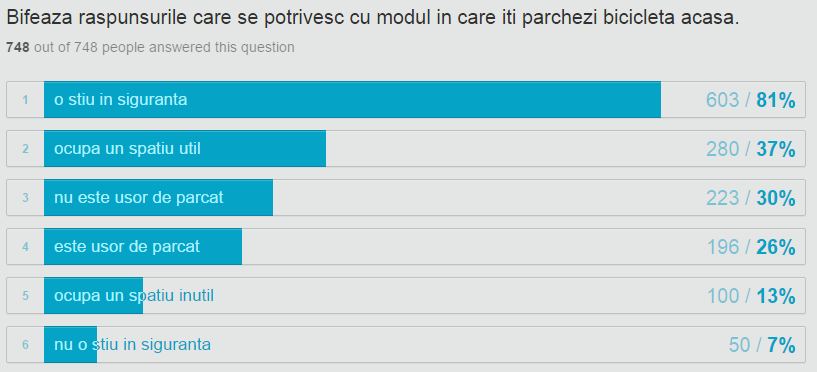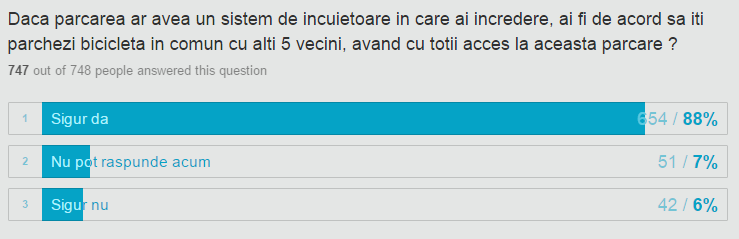 Sondajul s-a desfăşurat în perioada 29 octombrie – 9 noiembrie, iar feedback-ul a fost foarte bun ca număr de participări la sondaj şi extrem de pozitiv ca răspunsuri. Astfel, potrivit sondajului peste 80% dintre cei interesaţi şi-ar dori să-şi poată lăsa în siguranţă bicicleta parcată afară, în faţa locuinţei, motivul pentru care acum o ţin acum în casă fiind siguranţa acesteia. Tot cei care au răspuns la sondaj au arătat însă că şi-ar dori să nu o mai ţină în casă întrucât „ocupă un spaţiu util”.
