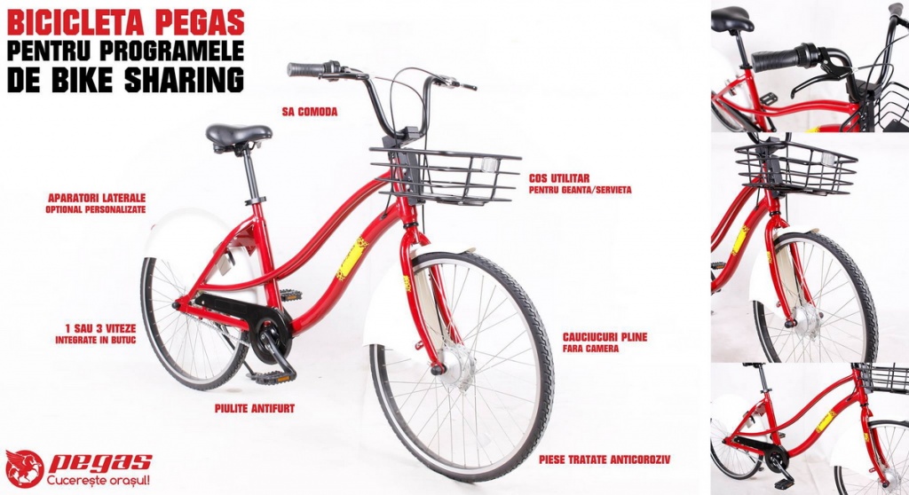 Bicicleta de bike sharing de la Pegas înglobează atributele specifice unei astfel de biciclete: calitatea materialelor, componentele tratate anticoroziv şi cu rezistenţă prelungită la intemperii, funcţionalitate optimă pe perioade mari de întrebuinţare, acţiuni minime de mentenanţă sau elemente securizate antifurt.