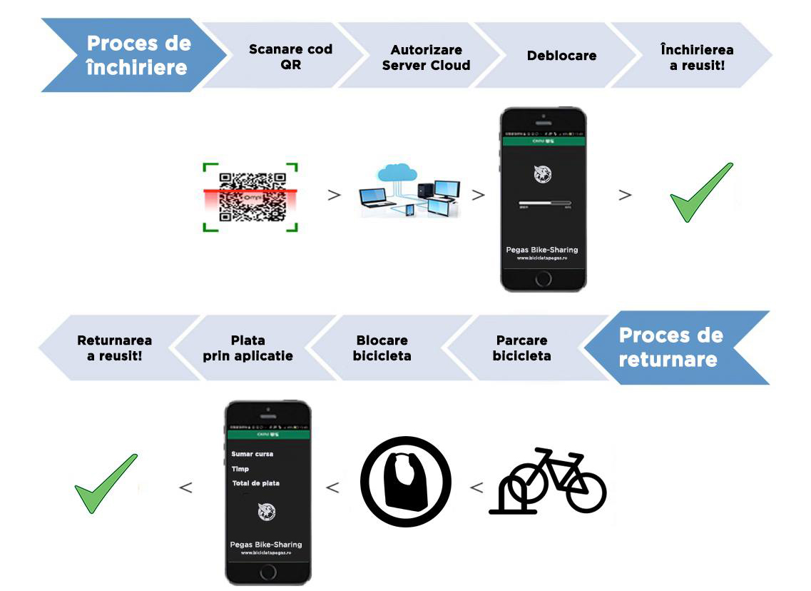 După cum deja știți, sistemul de bike-sharing este un serviciu comun care pune la dispoziţie şi permite oamenilor să împrumute o bicicletă pentru o perioada scurtă de timp. Smart Bike-sharing-ul imaginat de Atelierele Pegas se bazează pe un device discret montat pe bicicletă cu mai multe funcţii controlat printr-o aplicaţie de telefon. Acesta urmează un flux tehnologic uşor şi modern spre a uşura interacţiunea cu utilizatorul final.