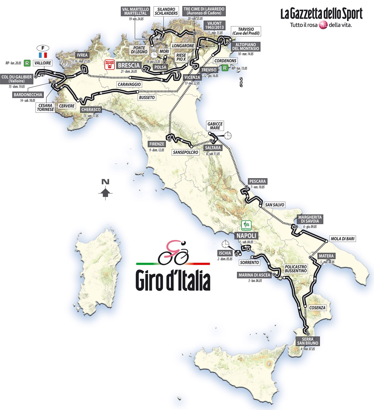 Concurenții cu pretenții la victorie vor trebui să treacă cu bine de 3 etape de contratimp, dintre care una este de contratimp pe munte, iar cealaltă de contratimp pe echipe, toate însumând aproape 89 de kilometri. Și, ca meniul să fie complet, 7 finișuri în urcare vor cerne sita favoriților. Turul Italiei 2013 va face un ocol și prin Franța pentru a escalada Col du Galibier, un munte sacru al ciclismului, dar nu va neglija nici pantele lui Passo del Stelvio, Gavia sau Trois Cimes du Lavaredo.