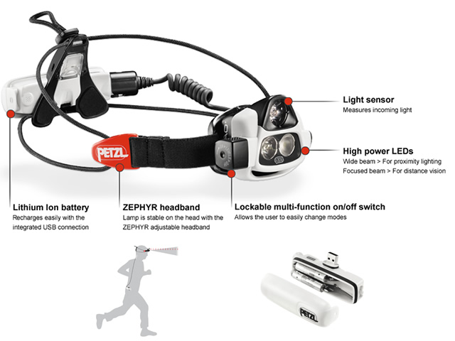 Vine echipată cu un acumulator Litium Ion ce se poate încărca, conform trend-urilor actuale, printr-o mufă USB. Noua lampă frontală Petzl Nao beneficiază de banda de prindere Zephyr, ajustabilă. Poți de asemenea să setezi modeul de iluminare al lămpii sau îl poți bloca asemenea unei comenzi de Lock-Out.