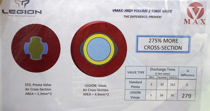 Noul miez de valvă tubeless Legion VMAX înlocuiește miezul tradițional cu un sistem format dintr-un corp cu două găuri. Nuca de sus e dezfiletează pentru a permite să treacă aerul și se înfiletează pentru a închide sistemul. O garnitură în partea de jos evită pierderile de aer iar când anvelopa e umflată aerul presează miezul valvei în sus păstrând presiunea până când acesta este apăsat cu mâna sau de către pompă. Practic funcționarea e identică cu cea a unei valve Presta normală, dar orificiul pentru aer este mult mai mare.