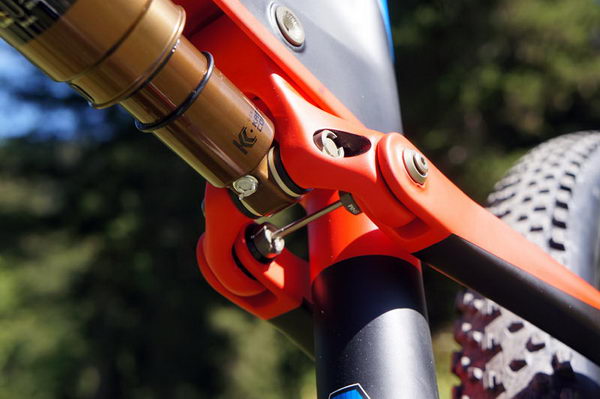 Şi linkul suspensiei este complet din carbon. Întrucât este atât de mic Orbea a spus că a fost dificil să-l realizeze din carbon. Ar fi fost mult mai uşor să-l prelucreze din aluminiu însă în felul asta s-ar fi adăugat bicicletei40-50g în plus. Apoi în timpul testelor au observat că linkul era supus unor forţe care împingeau spre exterior. Rezultatul? Linkul era compromis după doar 75-80.000 de cicluri. Soluţia a venit prin instalarea unei mici tije din oţel care ancora cele două parţi laterale ale linkului. Totul s-a rezolvat, iar această adiţie a pus doar încă 4 g suplimentare pe bicicletă. Orbea s-a gândit să folosească titan pentru această tijă însă greutatea s-ar fi redus cu doar 1 g în schimb preţul ar fi crescut considerabil.