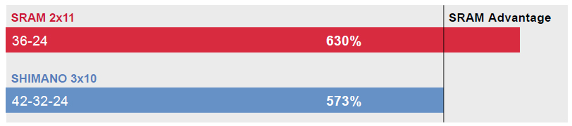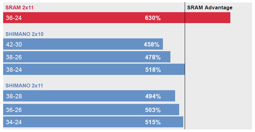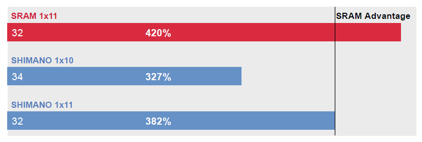 Sram subliniază din start că oferă cea mai largă gamă de viteze în comparaţie cu Shimano. Desigur această gamă largă vine la pachet cu un salt mai mare între viteze. În cele din urmă ciclistul decide ce este mai bun pentru el sau ea: treceri mai line între viteze, lucru care îţi permite să-ţi găseşti ritmul pentru cadenţă, sau posibilitatea obţinerii celei mai largi game de viteze.