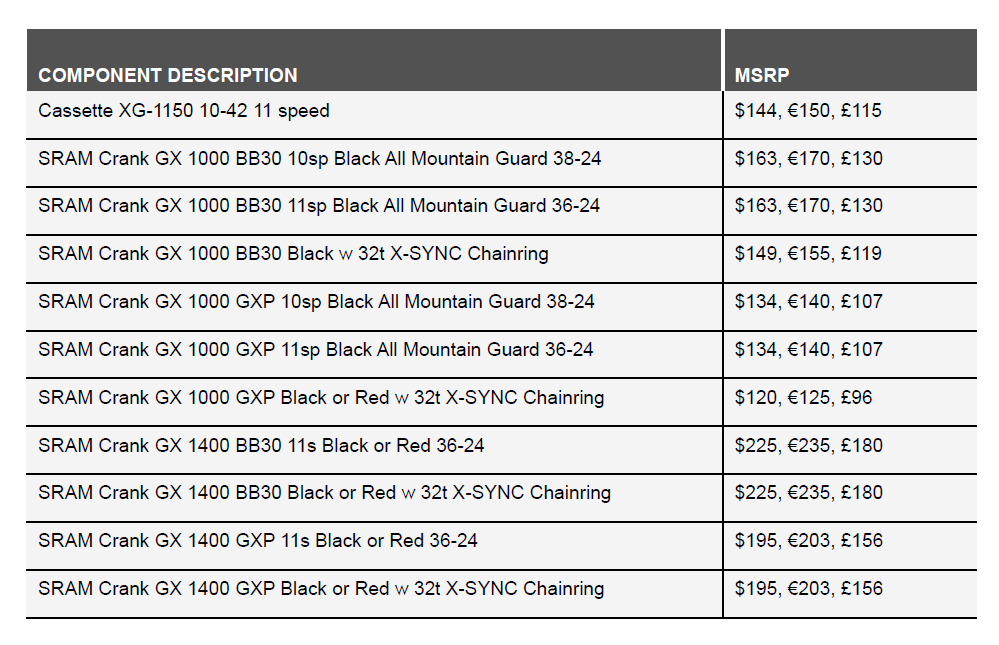 Cealaltă mare ştire este lansarea transmisiei 2×11 care foloseşte pinioanele Sram cu plajă largă. Sistemul a cerut redesenarea completă a schimbătorului spate pentru ca acesta să facă faţă pinioanelor mari. Din tabel lipseşte transmisia Shimano XTR 3×11 (22-30-40 x 11-40) dar ideea este clară. Dacă transmisia Sram 1x nu oferă o plajă suficient de largă atunci noul GX 2×11 ar trebui să te satisfacă.