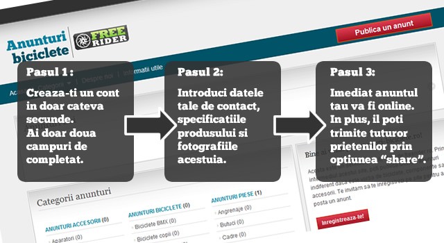Am creat acest site de anunturi astfel incat sa fie cat mai usor de utilizat dar sa ofere in acelasi timp un acces complet la informatiile publicate de tine. Asadar, fie ca esti biciclist, magazin sau dealer de biciclete, te invitam pe noul site de anunturi! Mentionam ca sectiunea veche de anunturi din freerider.ro va mai ramane activa pina la data de 1 ianuarie 2011, dupa care toate anunturi biciclete vor fi sterse.