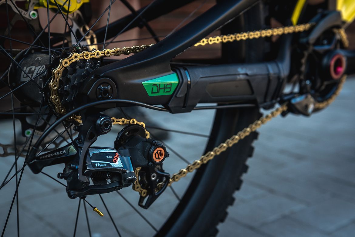 box-transmisieCei de la Box Components au pregătit o transmisie și pentru bicicletele de downhill, care momentan se află în probe, pe bicicleta lui Mick Hannah, cu un schimbător cu patină scurtă.
